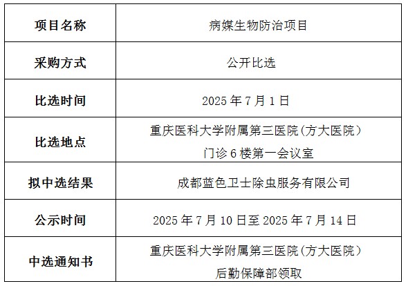 重医大附三院(方大医院)病媒生物防治项目中选结果公示
