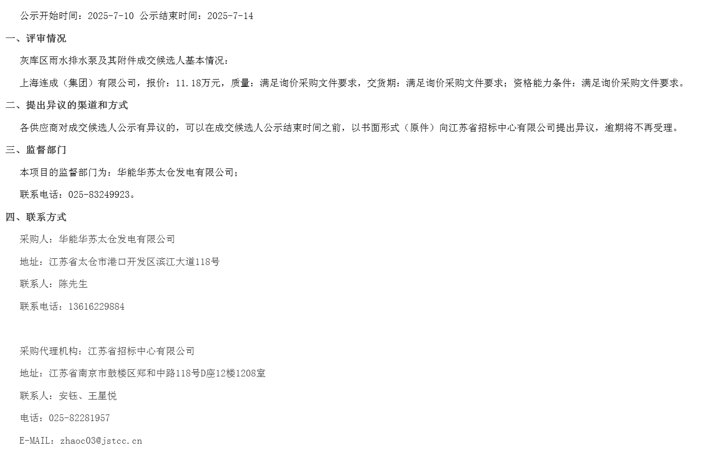 华能太仓2×100万千瓦机组扩建项目灰库区雨水排水泵及其附件成交候选人公示(JSTCC2500313547)