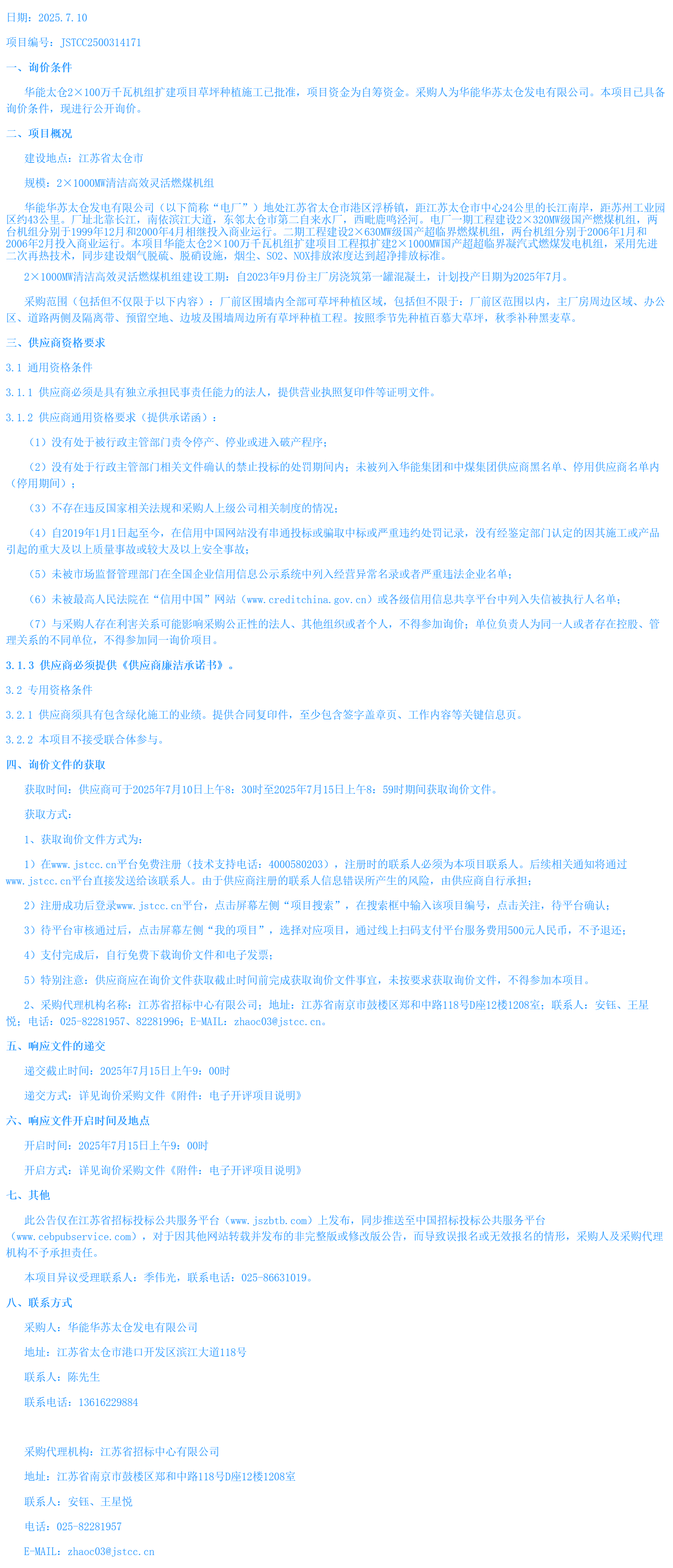 华能太仓*×***万千瓦机组扩建项目草坪种植施工询价公告(***************)