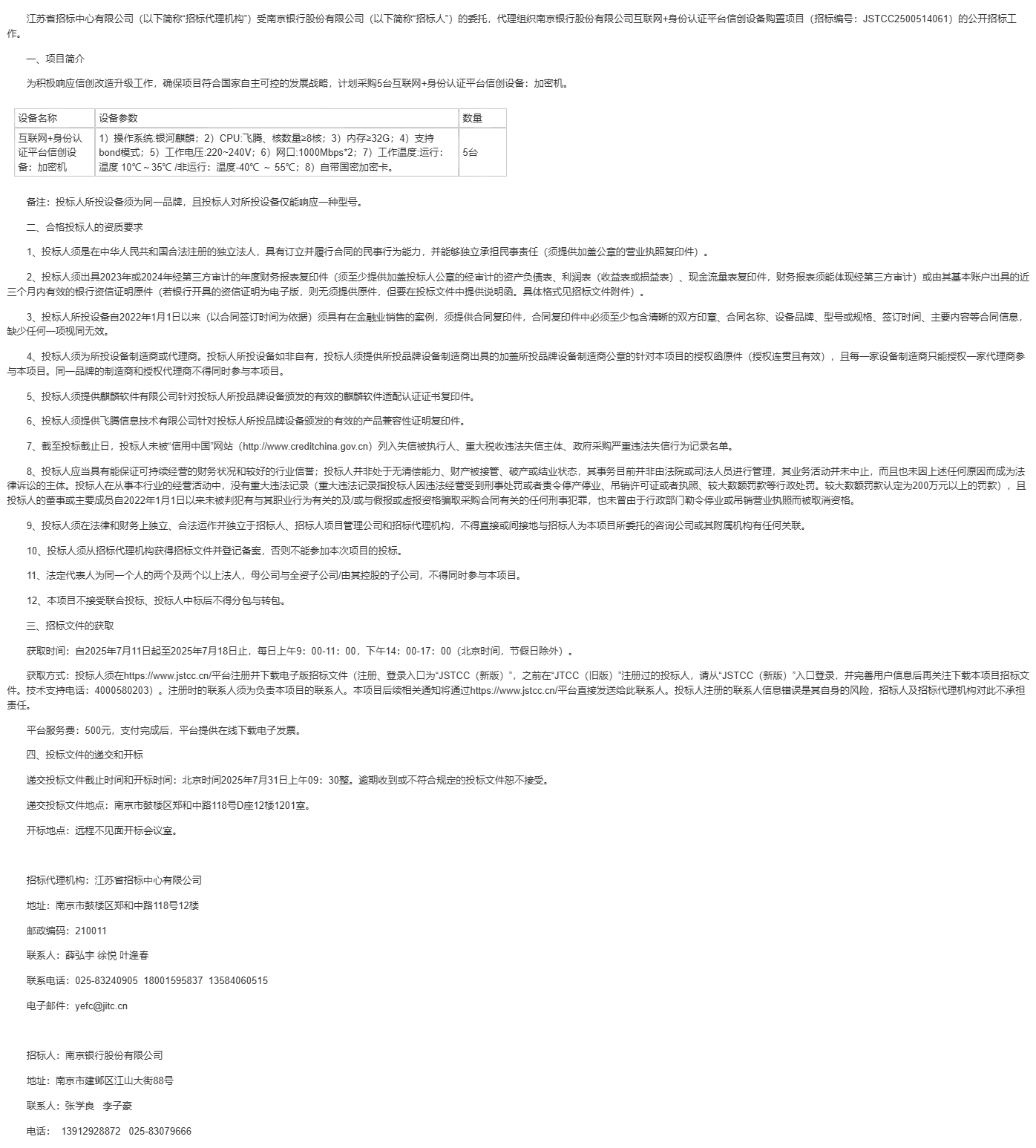 南京银行股份有限公司互联网+身份认证平台信创设备购置项目招标公告