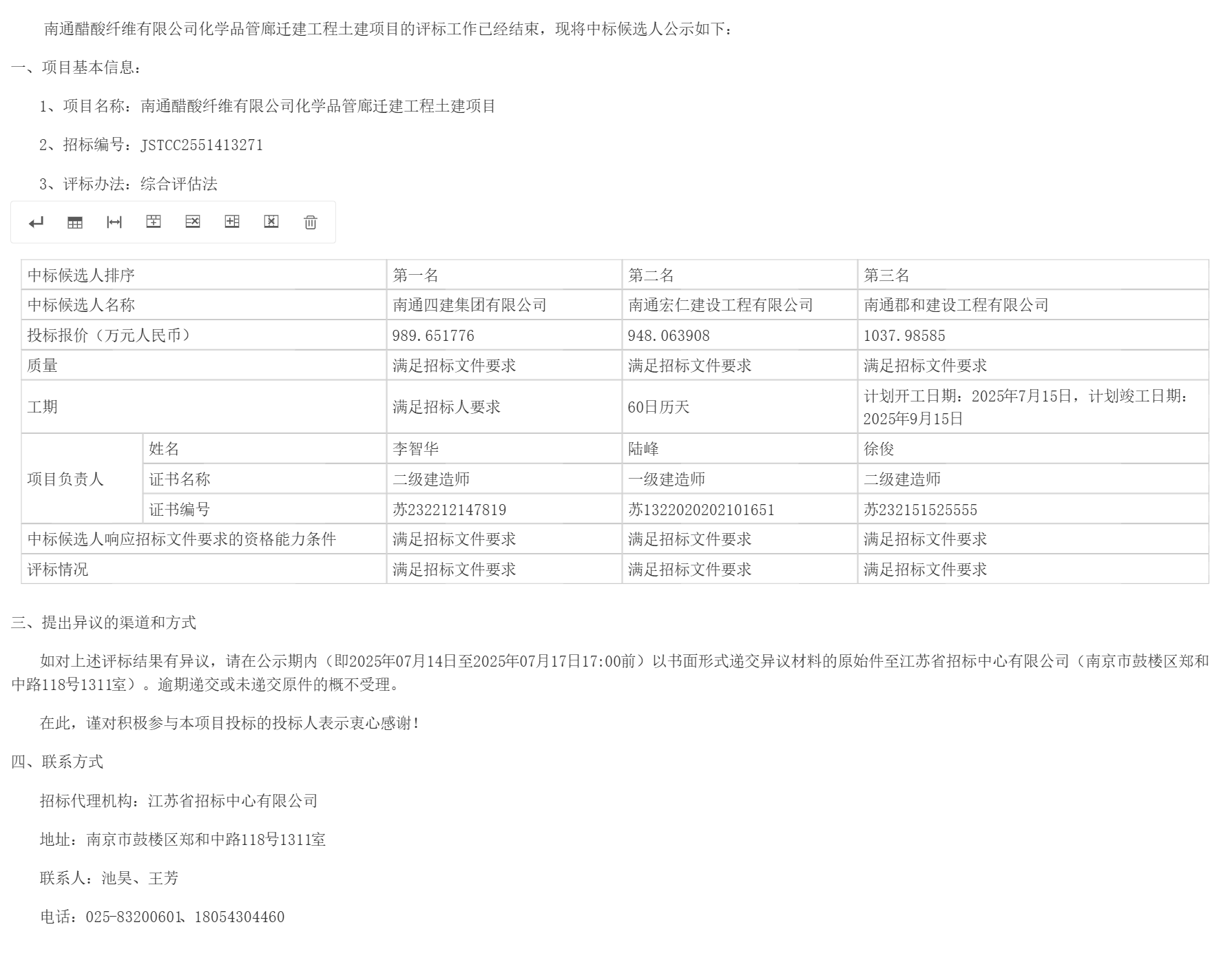 南通醋酸纤维有限公司化学品管廊迁建工程土建项目的评标工作已经结束,现将中标候选人公示如下: