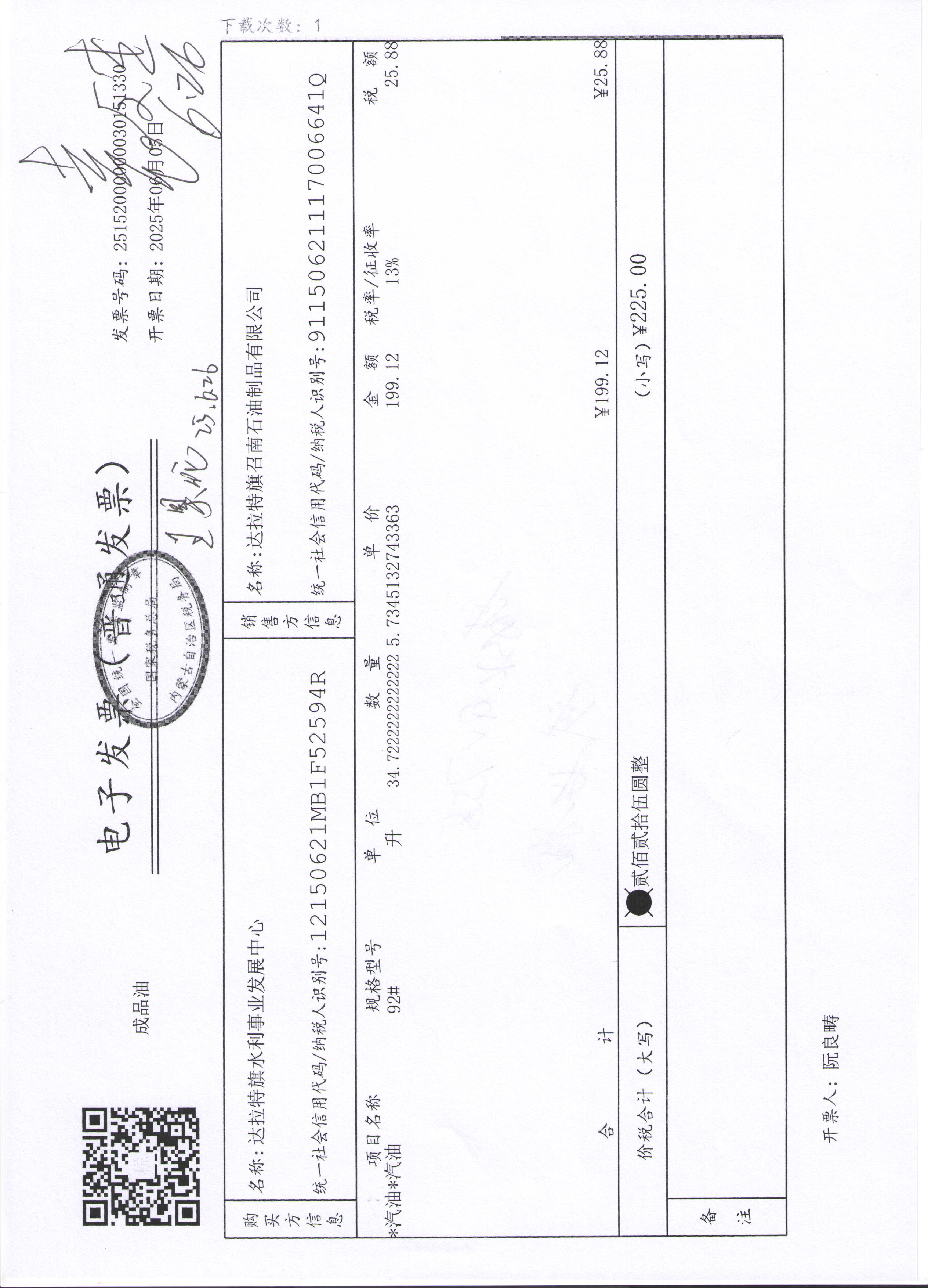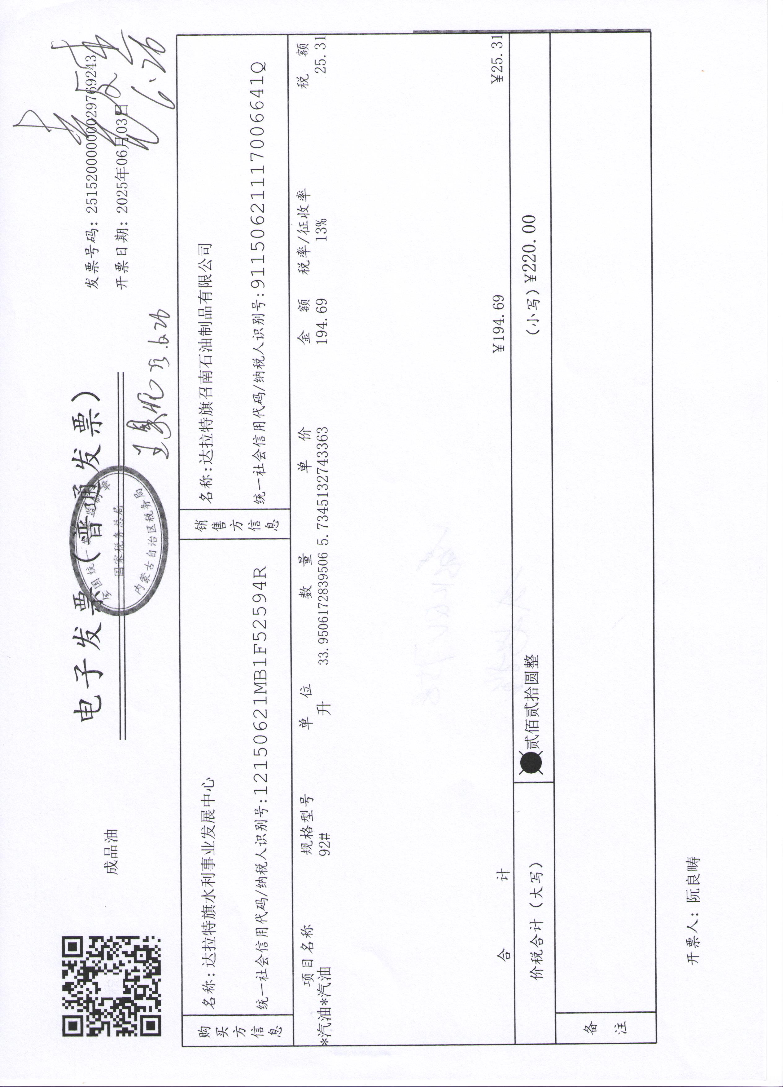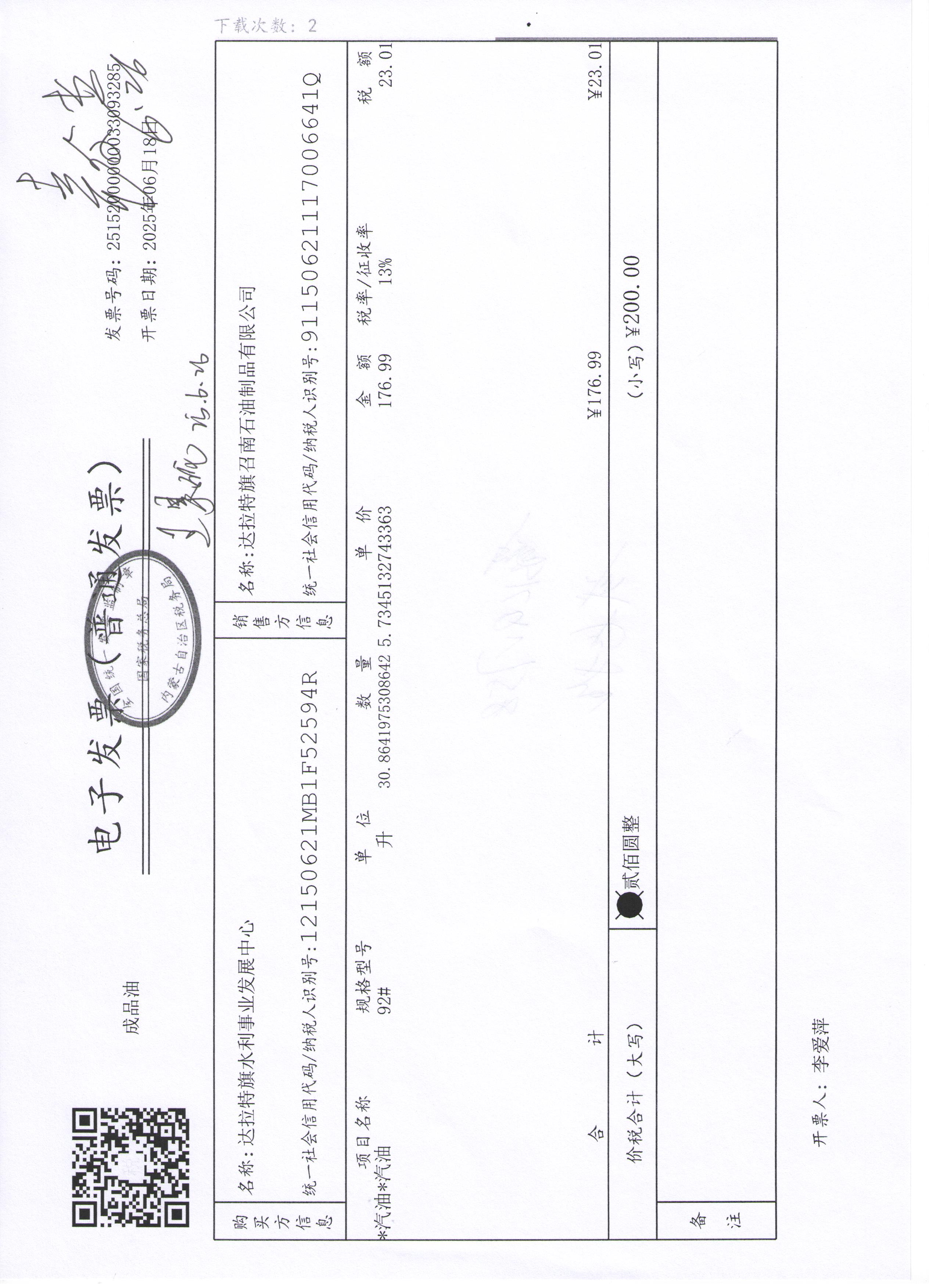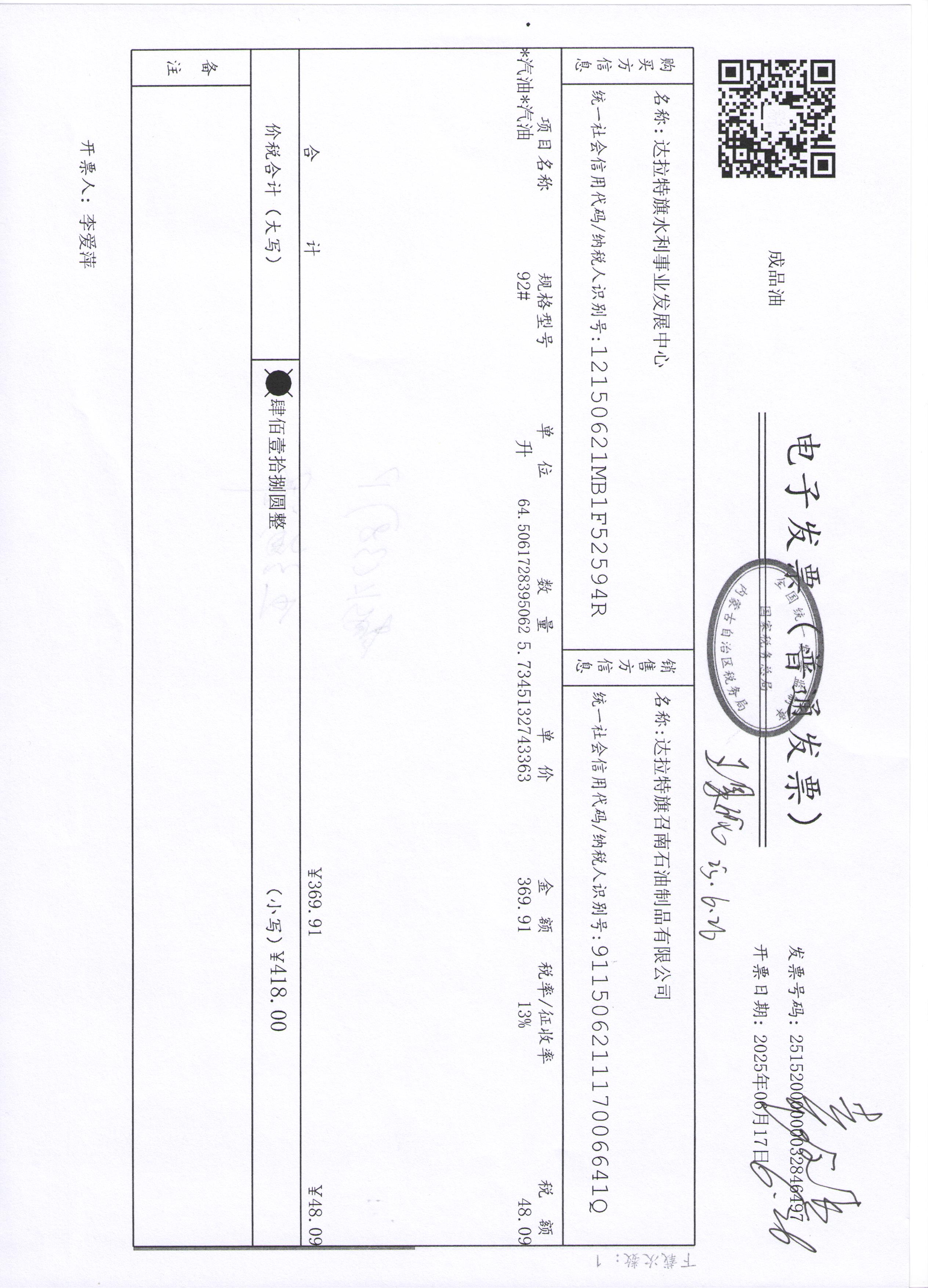 达拉特旗水利事业发展中心2507140024公务用车油燃费(高利平)政府采购合同公告