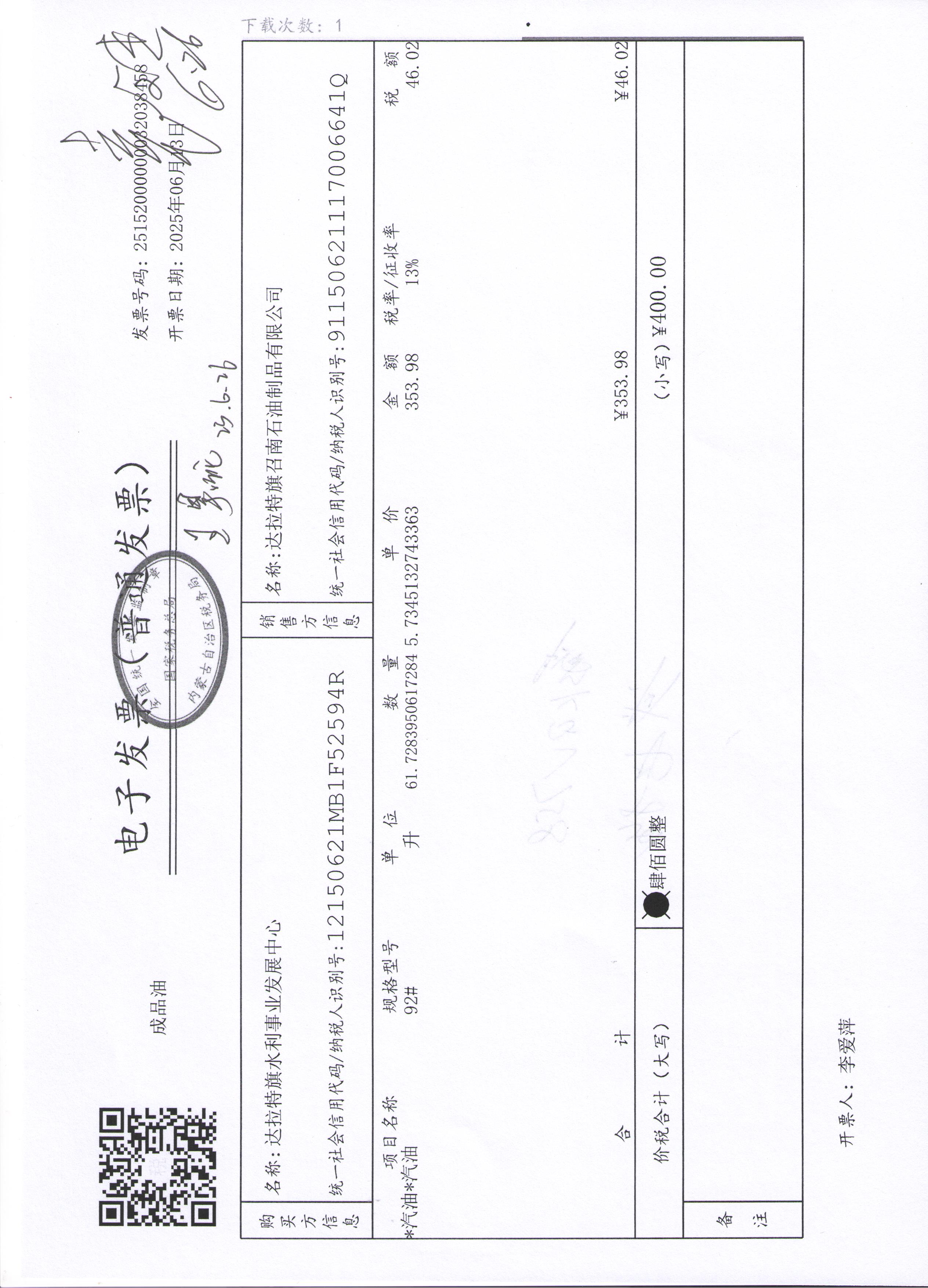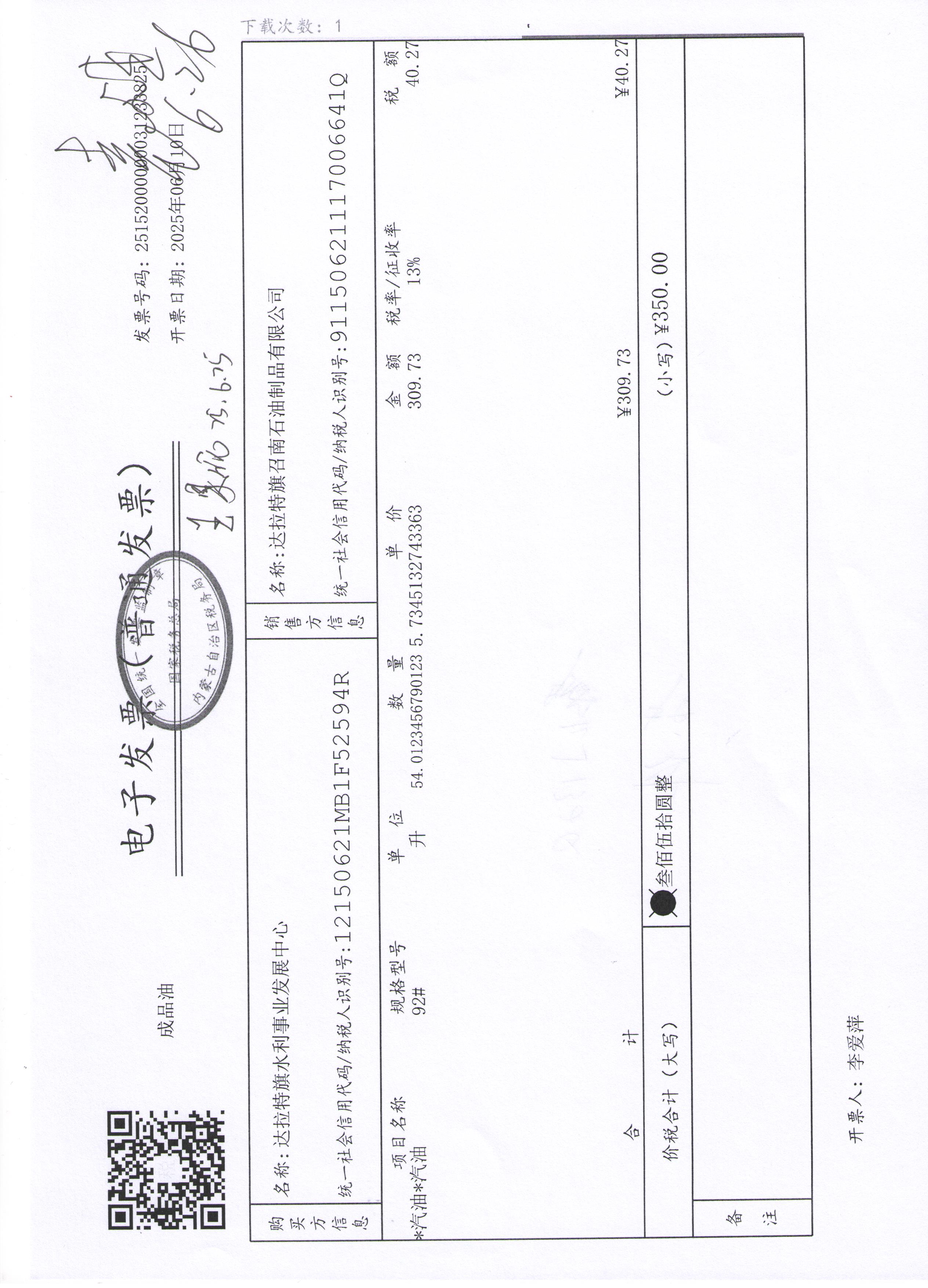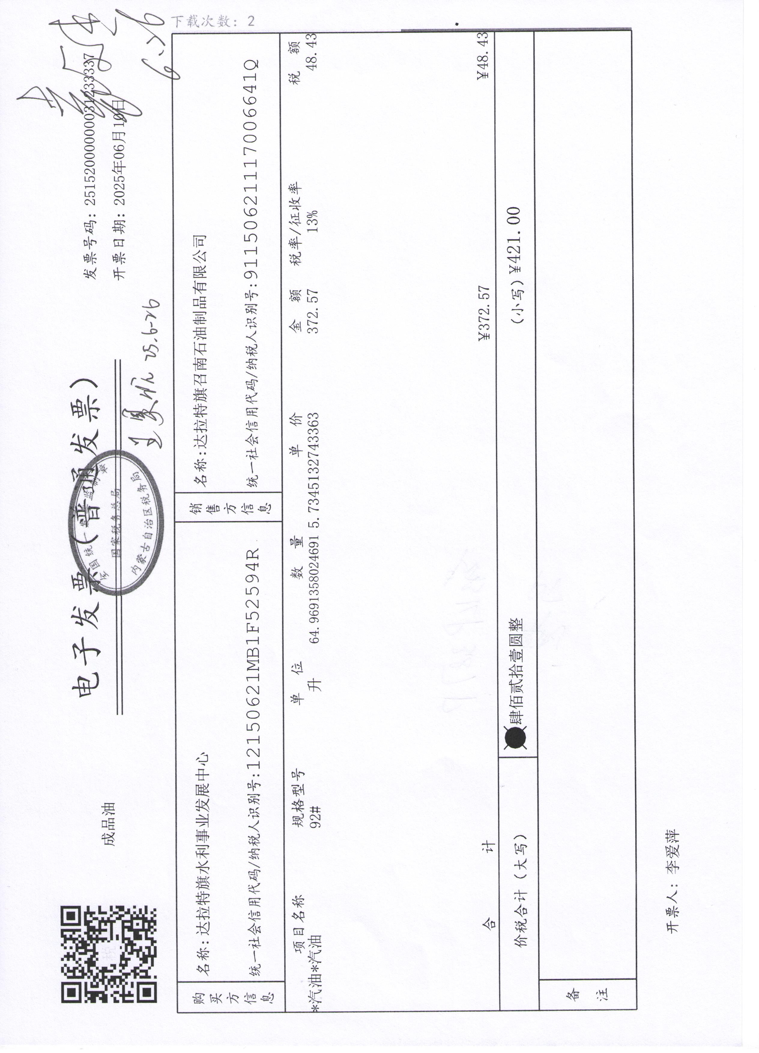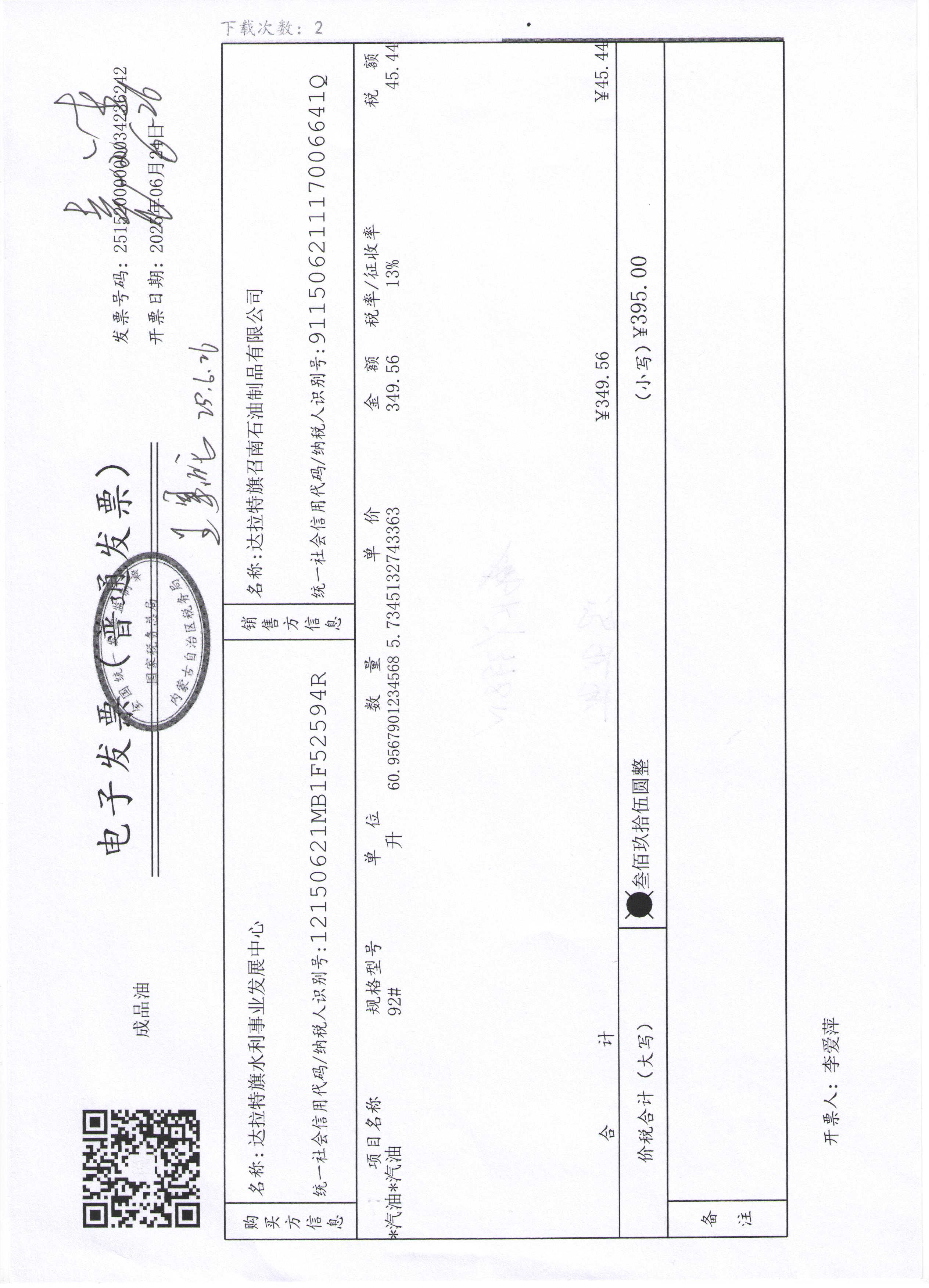 达拉特旗水利事业发展中心2507140024公务用车油燃费(高利平)政府采购合同公告