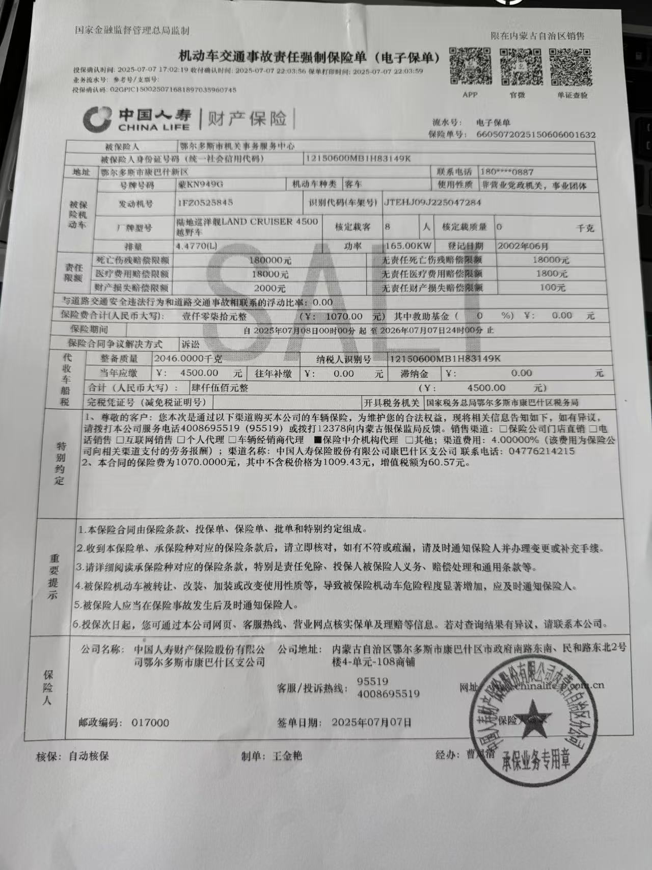 一、合同编号:无二、合同名称:蒙******保险三、项目编号:鄂财购备字(电子)[****]*****号四、项目名称:蒙******保险五、合同主体采购人(甲方):鄂尔多斯市机关事务服务中心 地址:鄂尔多斯市康巴什区 联系方式:*********** 供应商(乙方):中国人寿财产保险股份有限公司鄂尔多斯市中心支公司 地址:内蒙古自治区鄂尔多斯市东胜区内蒙古自治区鄂尔多斯市东胜区天骄街道鄂托克西街北迎宾路东鑫隆综合商务楼**楼西北侧 **楼整层 联系方式:*********** 六、合同主要信息主要标的: