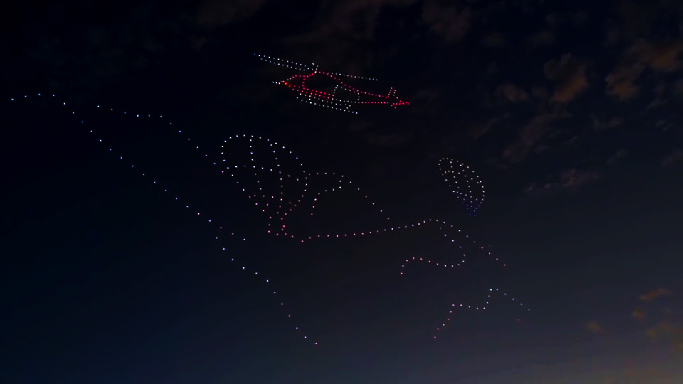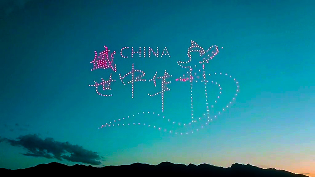 夜华露浓、星光微曦,当夕阳与霞光告别远山,夜幕徐徐降临,张掖七彩丹霞景区七彩虹霞观景平台星光点点。在倒计时中,点点星光缓缓升空化作灵动画笔,在不同星光色彩的切换间精准勾勒出“张掖七彩丹霞欢迎您”等文字形态,在场景切换间展示出直升机、热气球、动力伞等经营性项目,勾勒出七彩丹霞层理交错、色彩斑斓的地质肌理特征,吸引游客驻足昂首观看,引来阵阵喝彩与惊叹,大家纷纷为科技与创意融合的无人机飞行表演点赞。