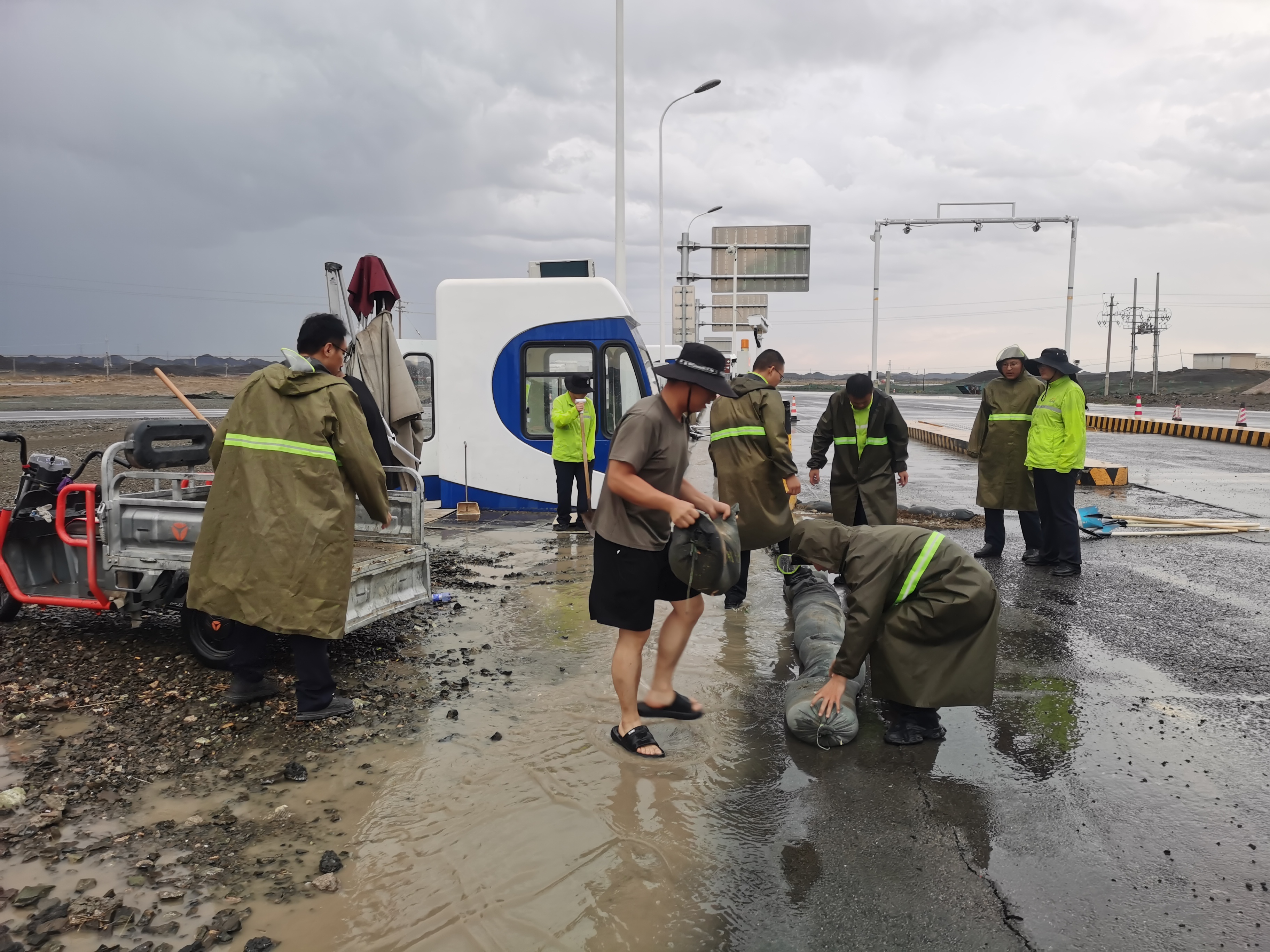 *月*日,马鬃山清障救援大队巡查至京新高速(白明段)上行线*****处,发现拦洪坝因雨水持续侵蚀出现局部损毁,随即出动*台设备、*名作业人员,对受损拦洪坝体及桥梁墩柱基础进行精准回填修复。并对修复区域及周边进行人工夯实、加固,经过*小时连续奋战,最终将该路段隐患排除。*月*日,柳园收费站因受降雨影响造成入口治超车道称台基坑内和外广场雨水堆积,柳园收费所调配抽水泵,对积水区域展开排水作业,并用防汛沙袋搭建临时防洪屏障,有效阻隔雨水倒灌,保障供电设施安全。