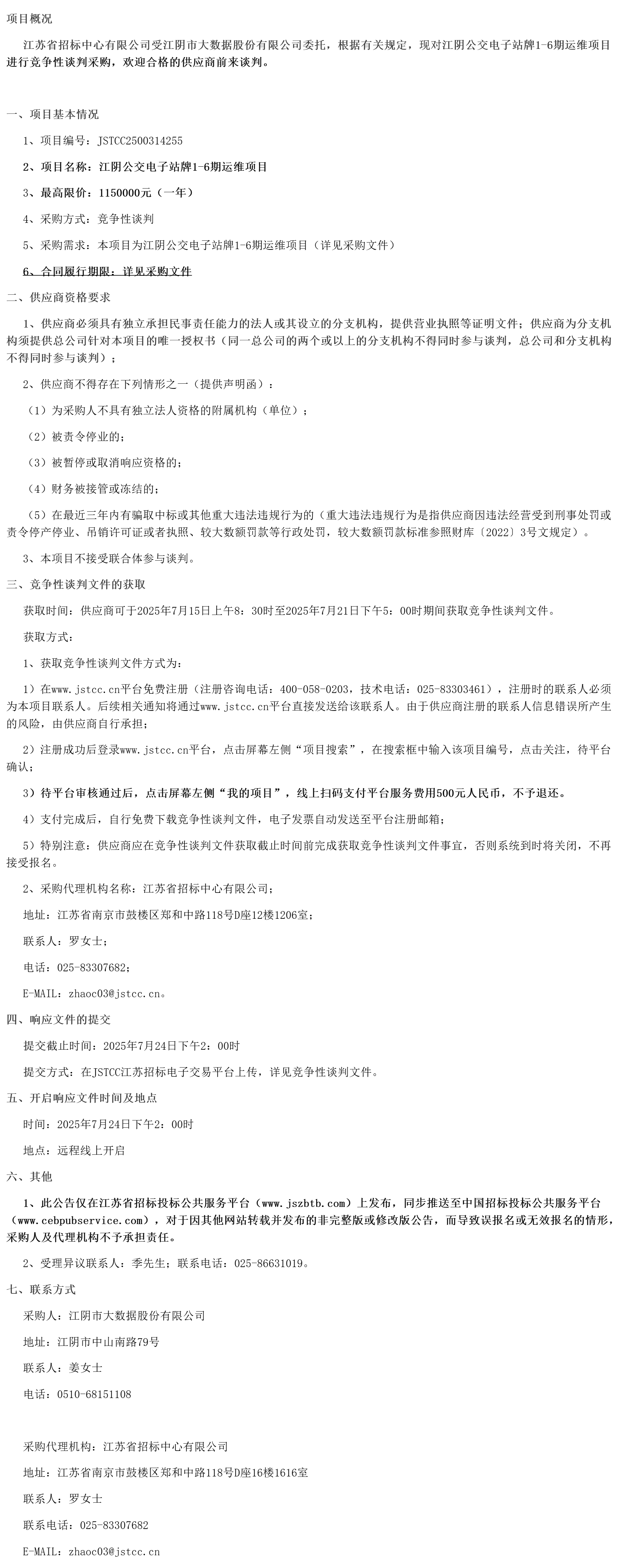 江阴市大数据股份有限公司江阴公交电子站牌***期运维项目竞争性谈判公告(*************** )