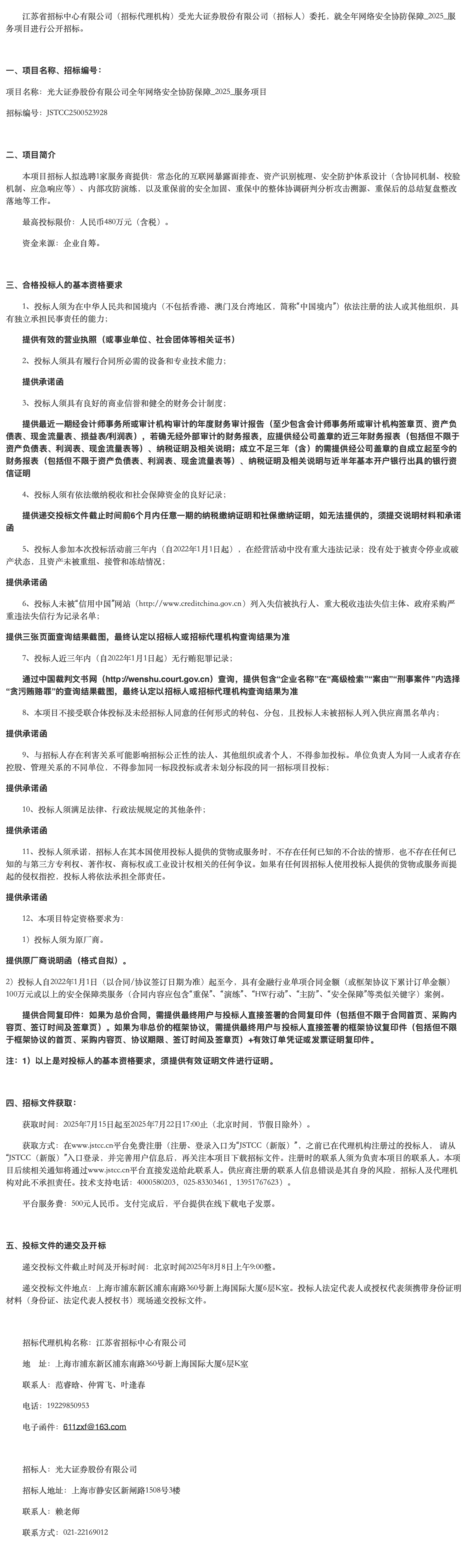 江苏省招标中心有限公司(招标代理机构)受光大证券股份有限公司(招标人)委托,就全年网络安全协防保障******服务项目进行公开招标。