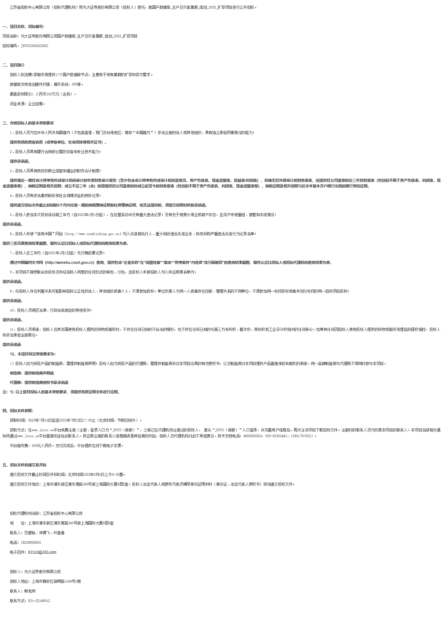 江苏省招标中心有限公司(招标代理机构)受光大证券股份有限公司(招标人)委托,就国产数据库*生产及灾备集群*信创******扩容项目进行公开招标。
