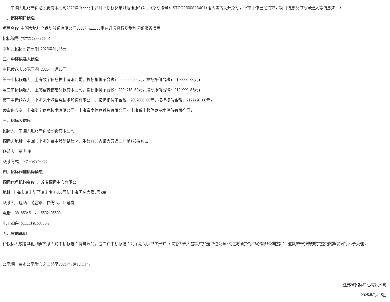 中国大地财产保险股份有限公司****年******平台订阅授权及集群运维服务项目中标候选人公示