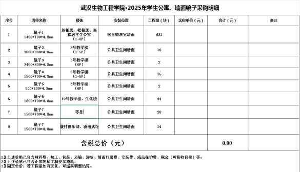 一、项目名称:武汉生物工程学院学生公寓、教学楼盥洗室墙面镜子采购项目