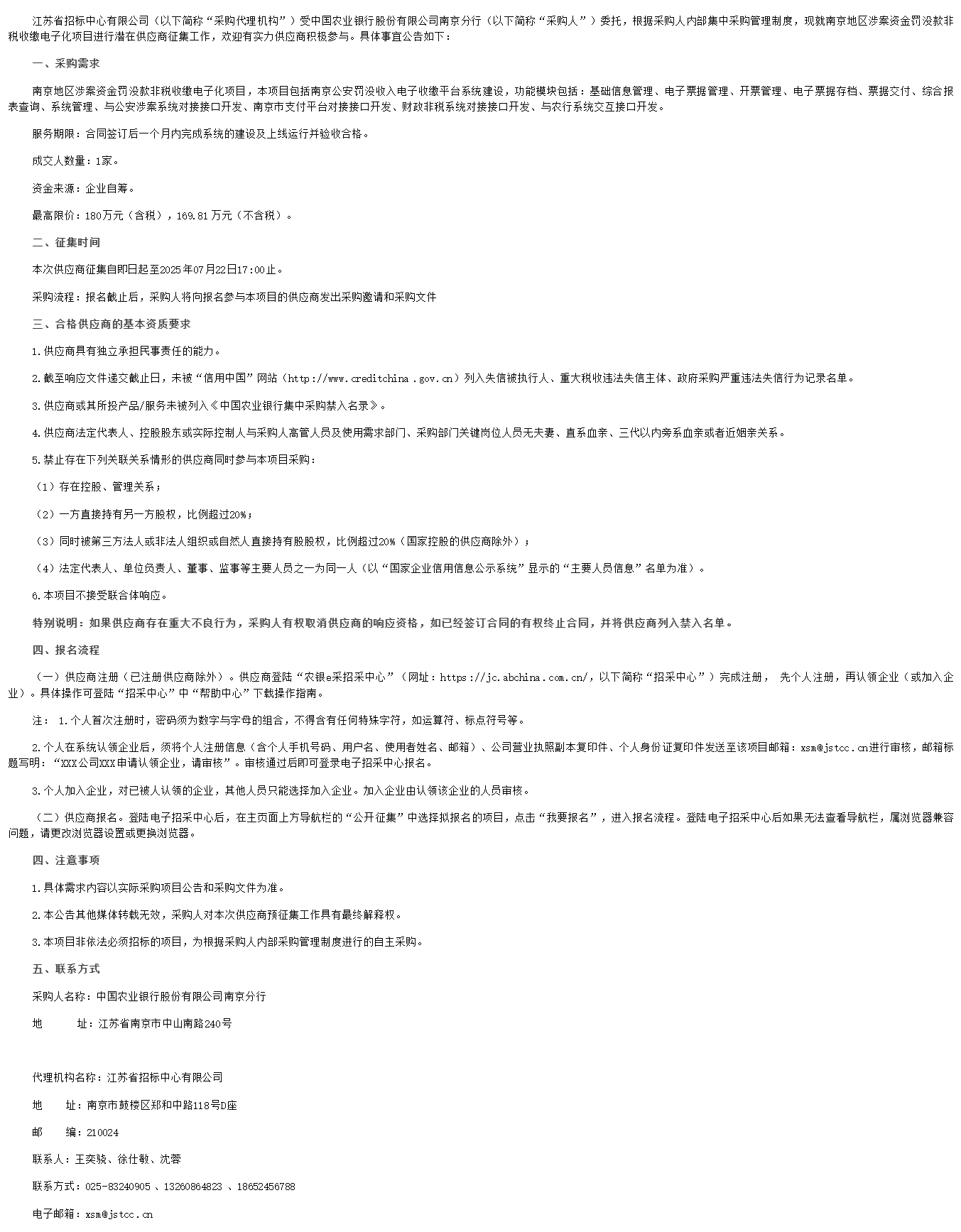 江苏省招标中心有限公司(以下简称“采购代理机构”)受中国农业银行股份有限公司南京分行(以下简称“采购人”)委托,根据采购人内部集中采购管理制度,现就南京地区涉案资金罚没款非税收缴电子化项目进行潜在供应商征集工作,欢迎有实力供应商积极参与。具体事宜公告如下: