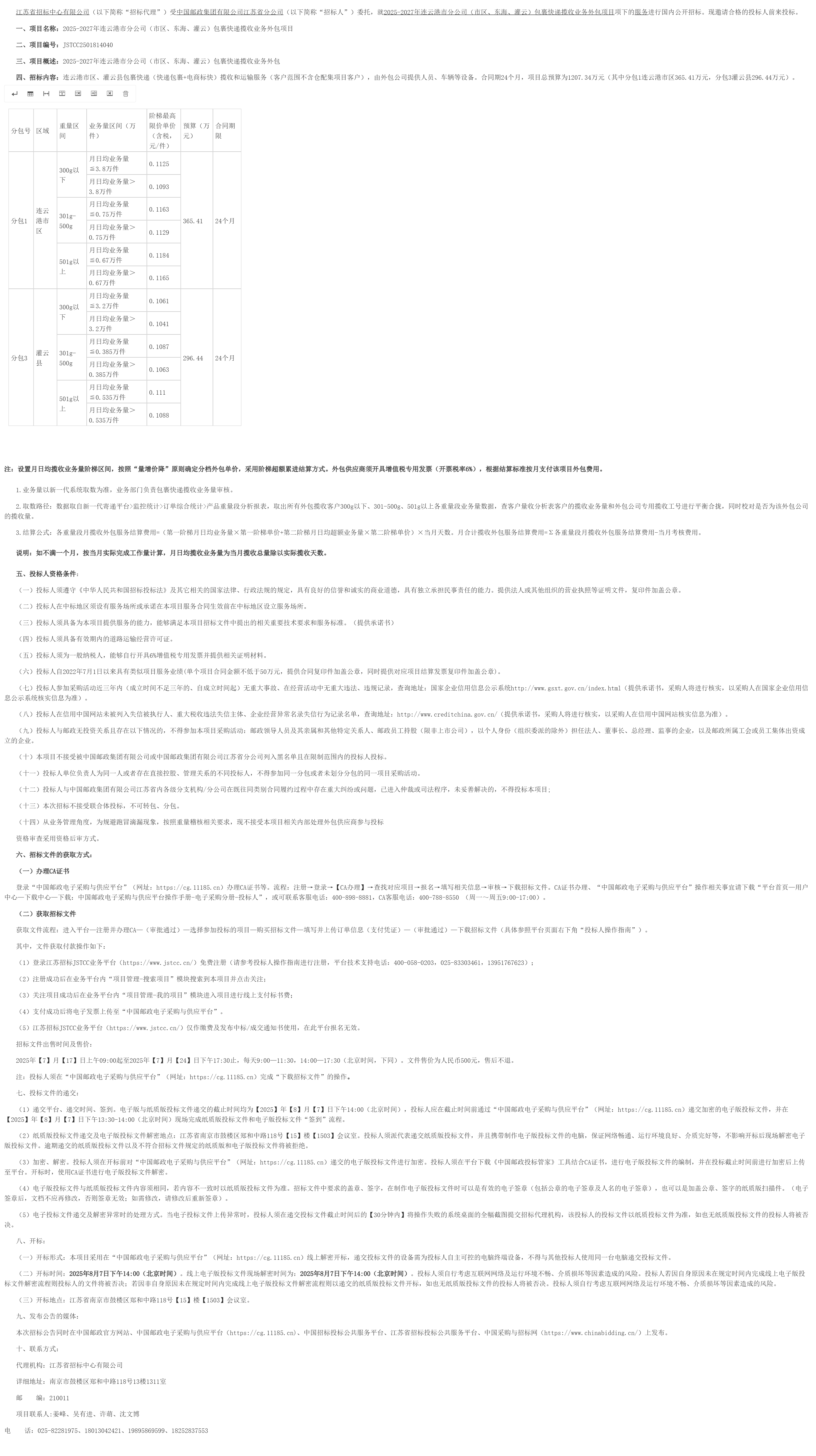 *********年连云港市分公司(市区、东海、灌云)包裹快递揽收业务外包项目(第二次)招标公告