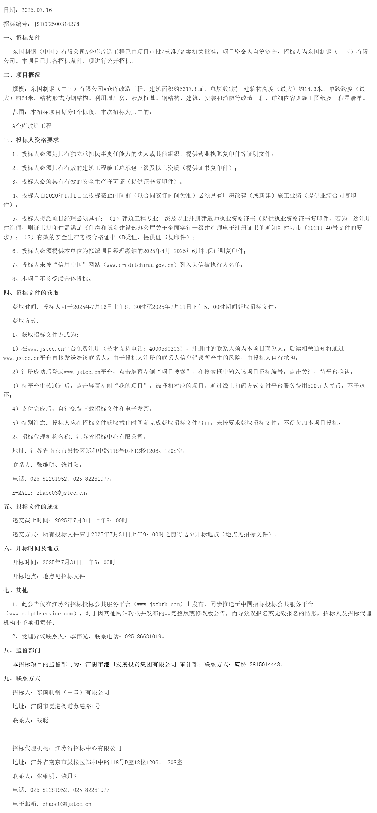 东国制钢(中国)有限公司*仓库改造工程已由项目审批/核准/备案机关批准,项目资金为自筹资金。招标人为东国制钢(中国)有限公司。本项目已具备招标条件,现进行公开招标。