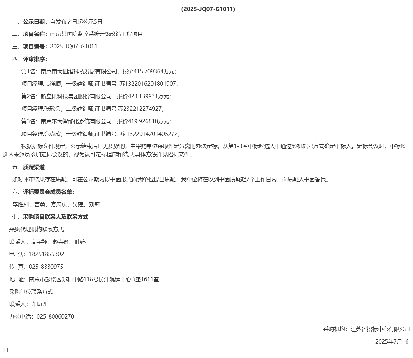 南京某医院监控系统升级改造工程项目*中标候选人公示