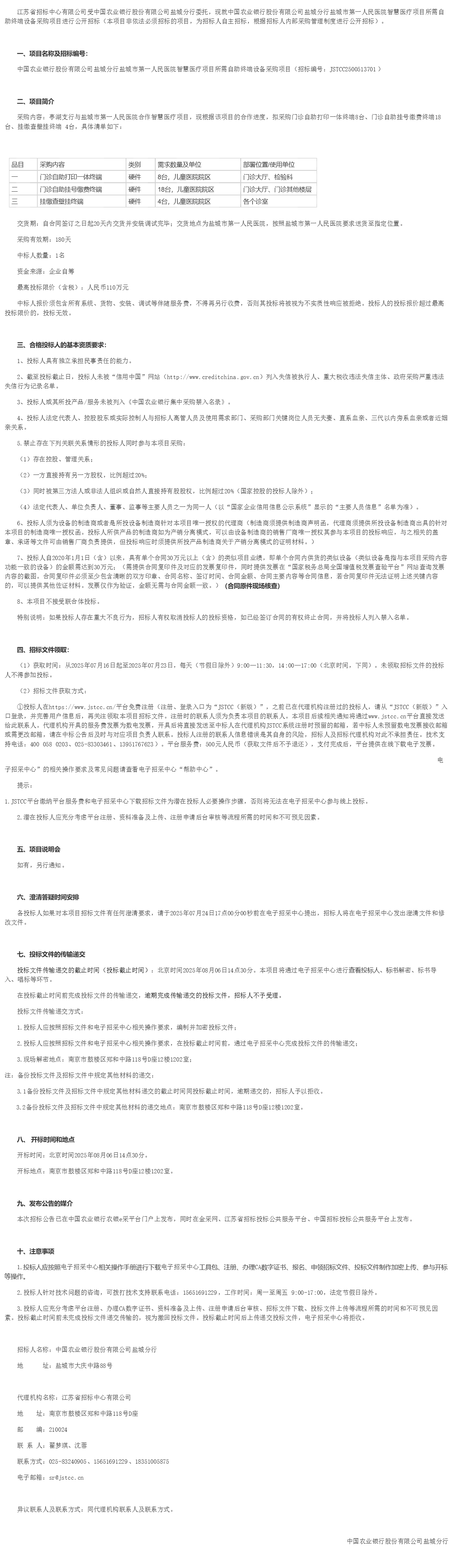 江苏省招标中心有限公司受中国农业银行股份有限公司盐城分行委托,现就中国农业银行股份有限公司盐城分行盐城市第一人民医院智慧医疗项目所需自助终端设备采购项目进行公开招标(本项目非依法必须招标的项目,为招标人自主招标,根据招标人内部采购管理制度进行公开招标)。