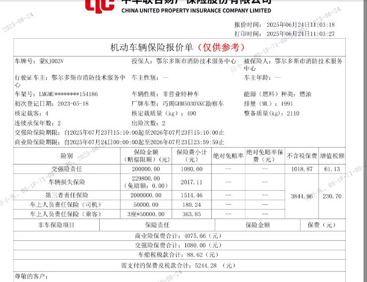 | * | ****.** | *(份) | ¥*,***.** | ¥*,***.** | 商业险保费合计:****.**(元) 交强险保费合计:****.**(元) 车船税税款合计:**.**(元) 合计:****.** |
