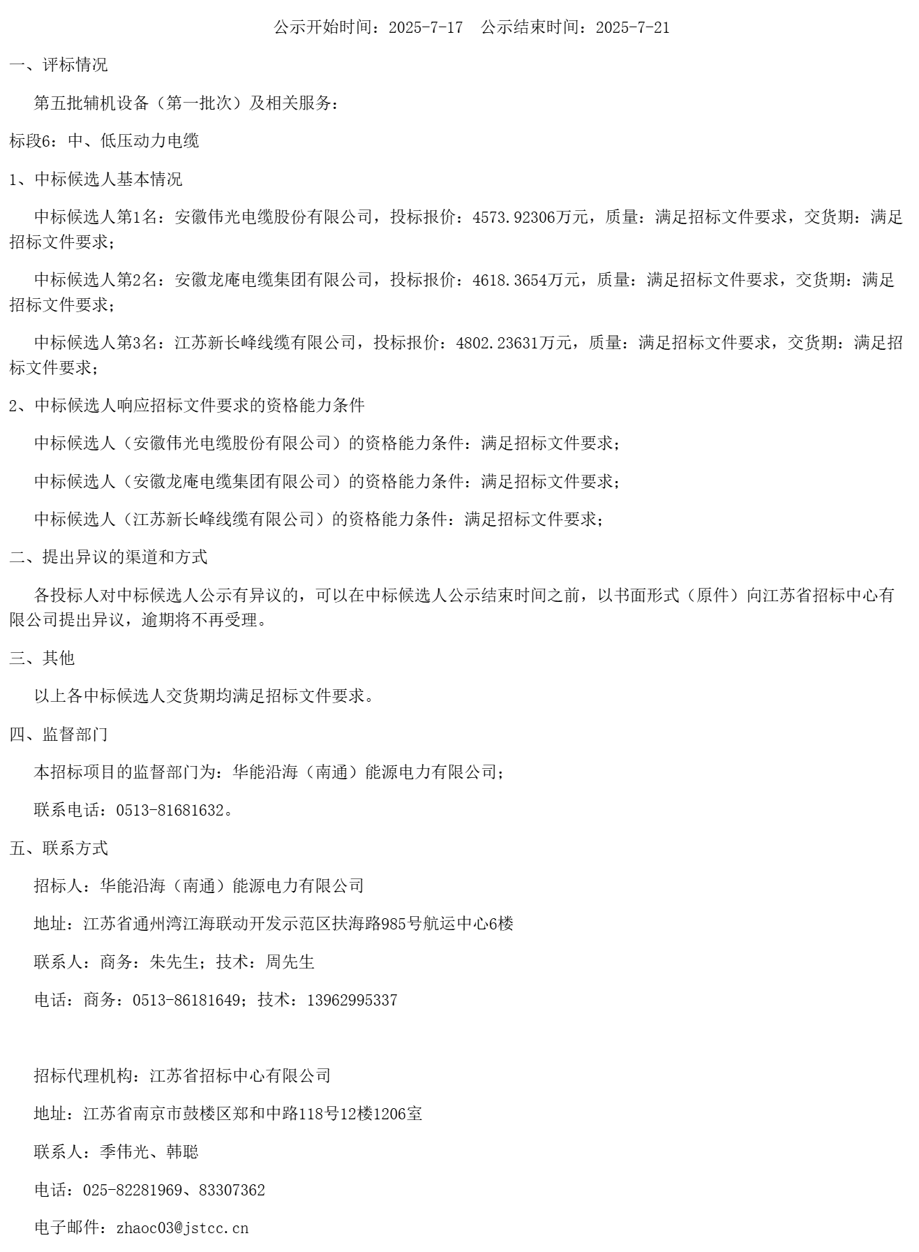 中标候选人第*名:江苏新长峰线缆有限公司,投标报价:****.*****万元,质量:满足招标文件要求,交货期:满足招标文件要求;