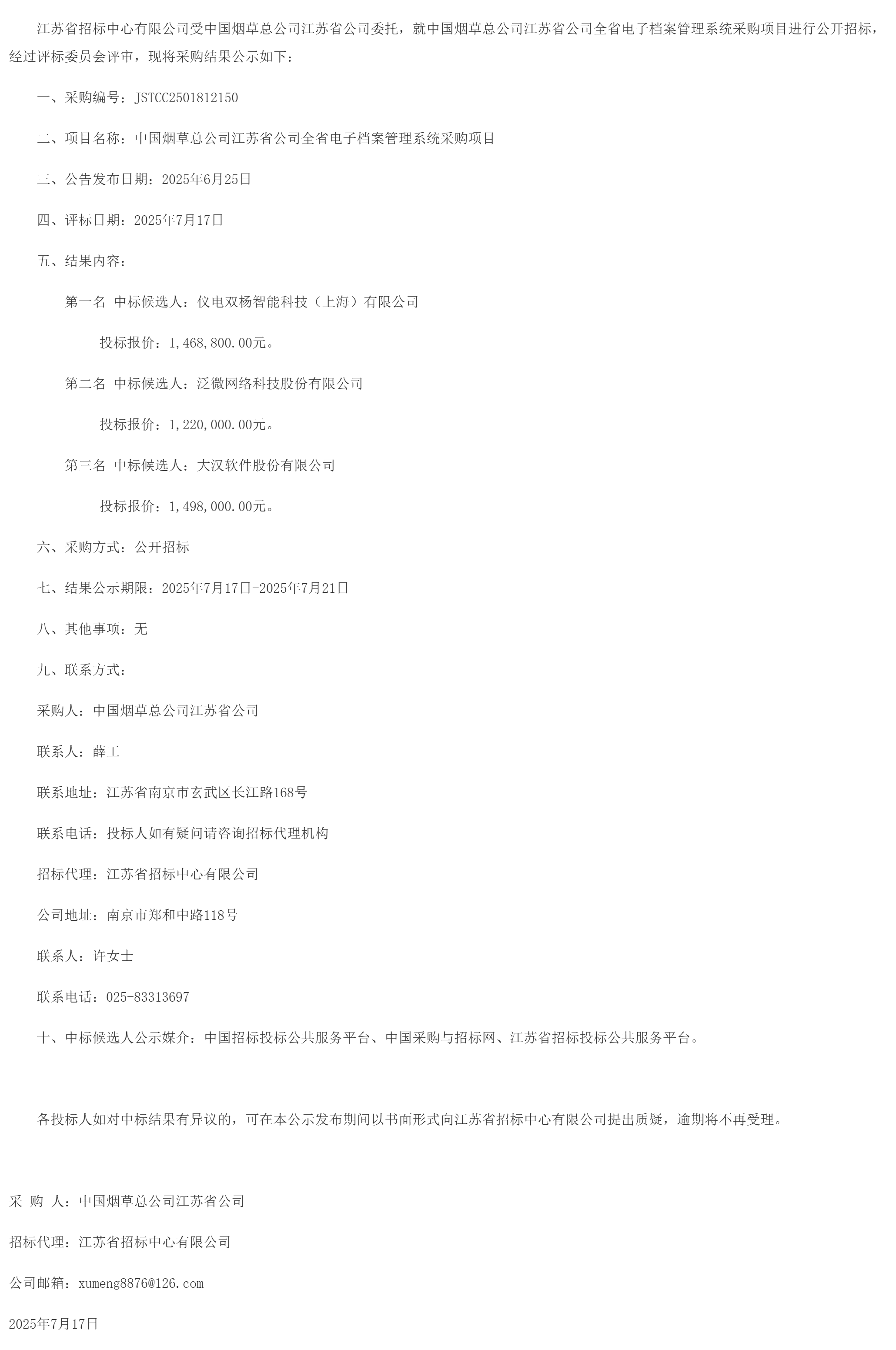 江苏省招标中心有限公司受中国烟草总公司江苏省公司委托,就中国烟草总公司江苏省公司全省电子档案管理系统采购项目进行公开招标,经过评标委员会评审,现将采购结果公示如下: