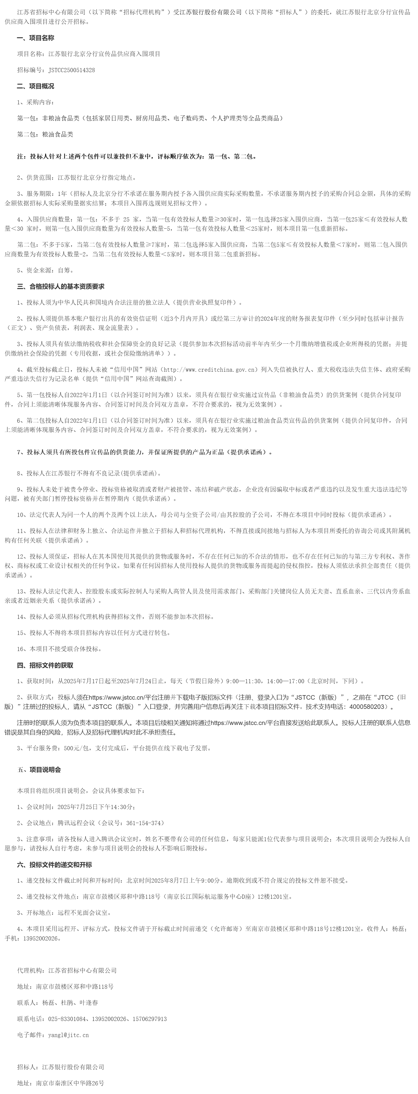 江苏省招标中心有限公司(以下简称“招标代理机构”)受江苏银行股份有限公司(以下简称“招标人”)的委托,就江苏银行北京分行宣传品供应商入围项目进行公开招标。