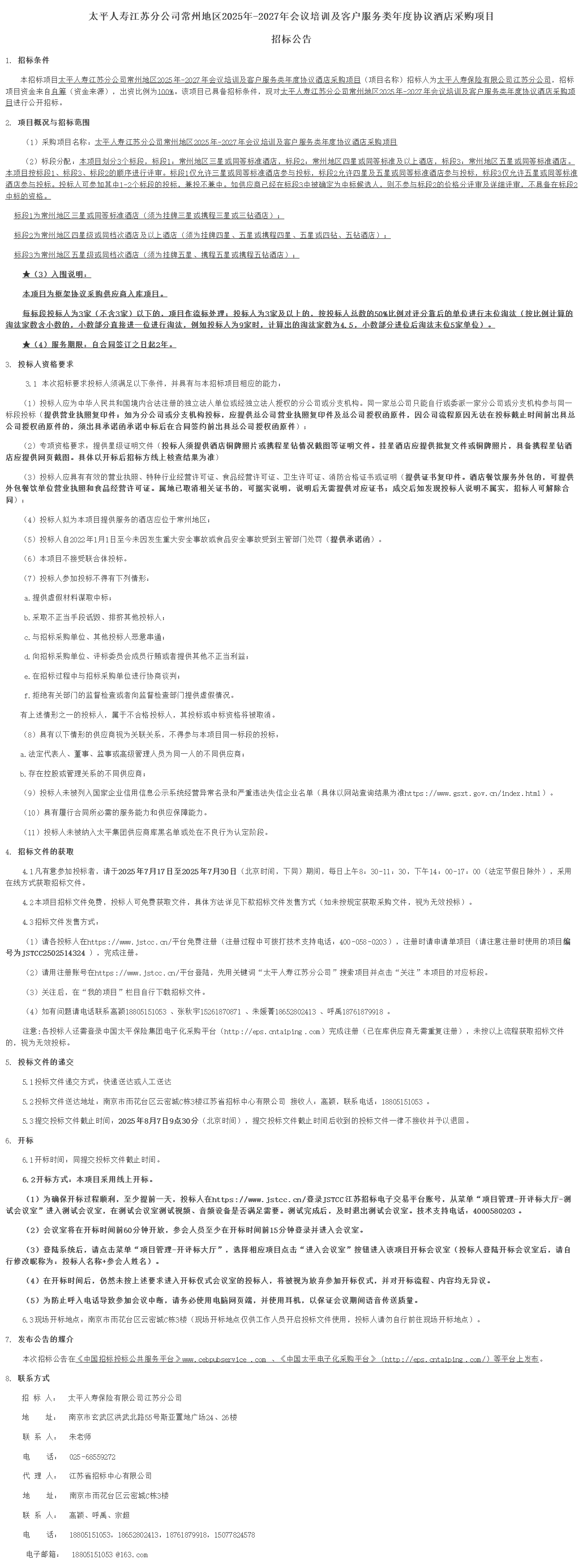 太平人寿江苏分公司常州地区****年*****年会议培训及客户服务类年度协议酒店采购项目招标公告