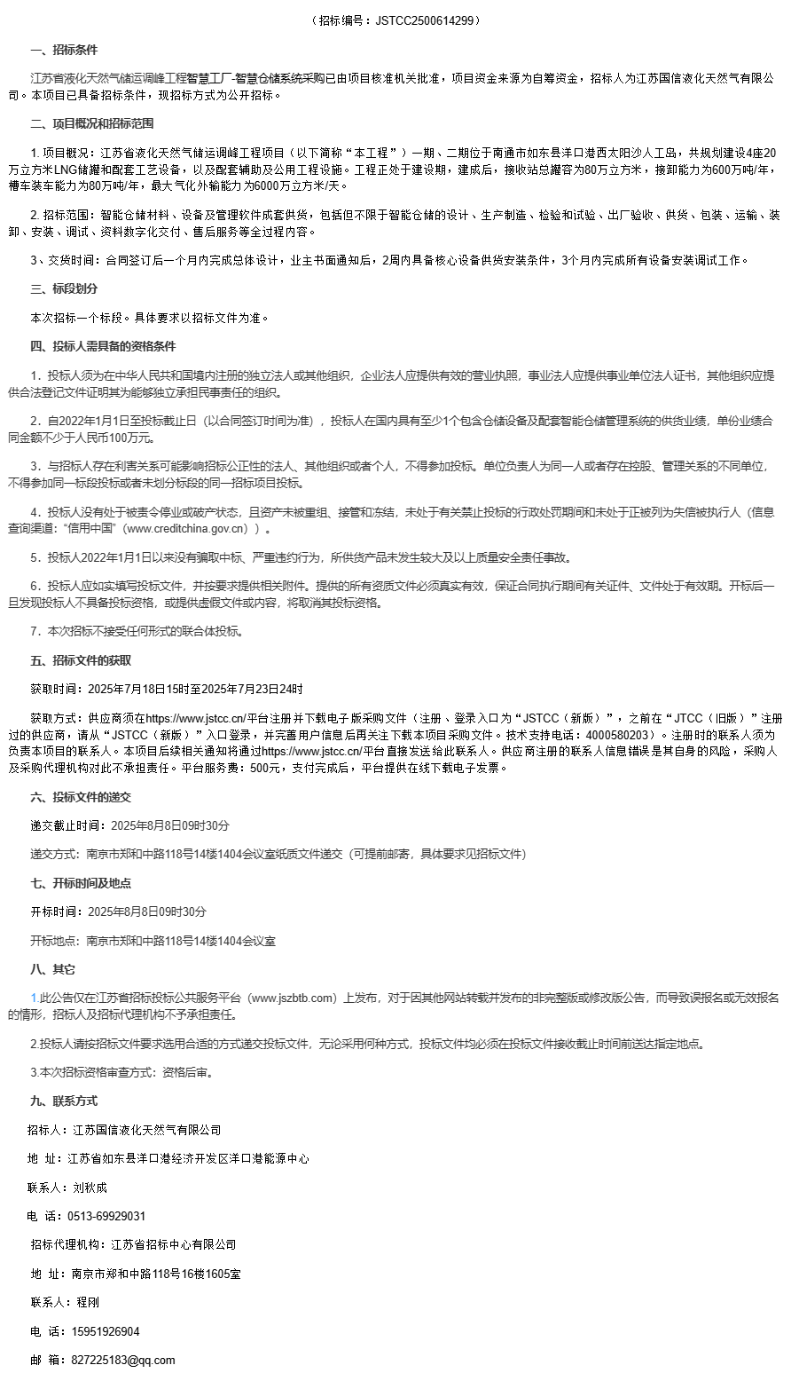 江苏省液化天然气储运调峰工程智慧工厂*智慧仓储系统采购招标公告