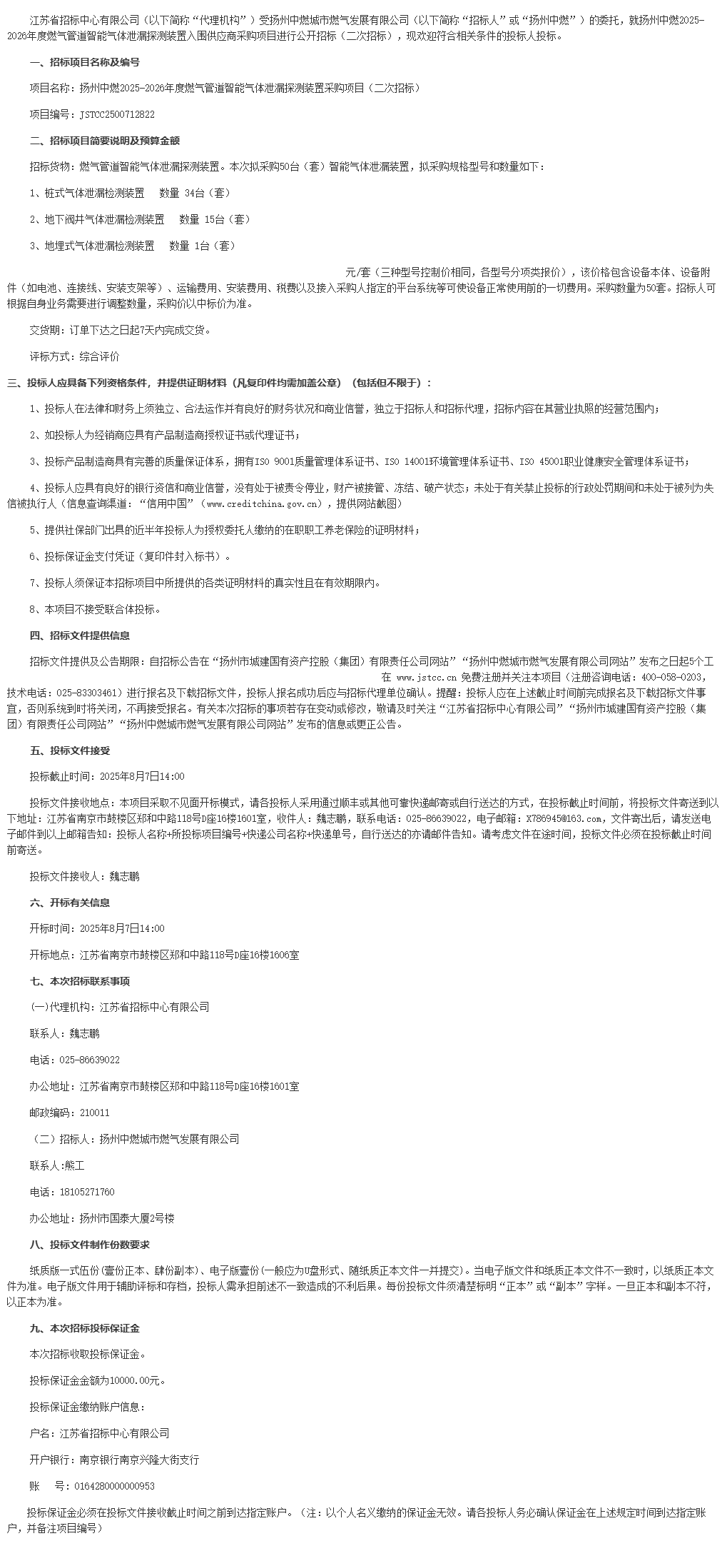 江苏省招标中心有限公司(以下简称“代理机构”)受扬州中燃城市燃气发展有限公司(以下简称“招标人”或“扬州中燃”)的委托,就扬州中燃*********年度燃气管道智能气体泄漏探测装置入围供应商采购项目进行公开招标(二次招标),现欢迎符合相关条件的投标人投标。