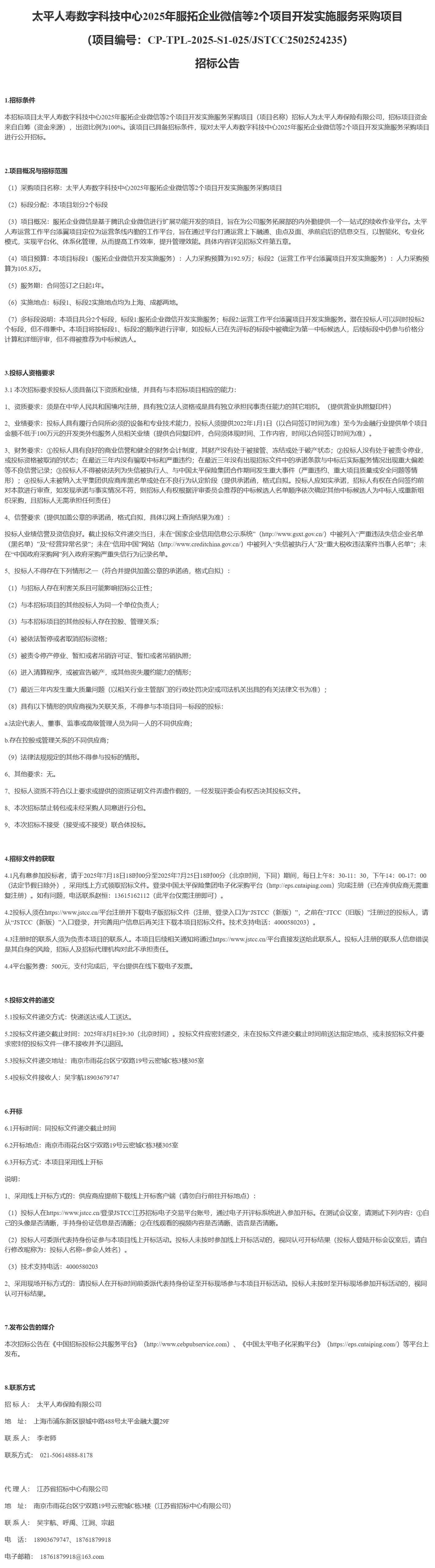 太平人寿数字科技中心****年服拓企业微信等*个项目开发实服务采购项目招标公告