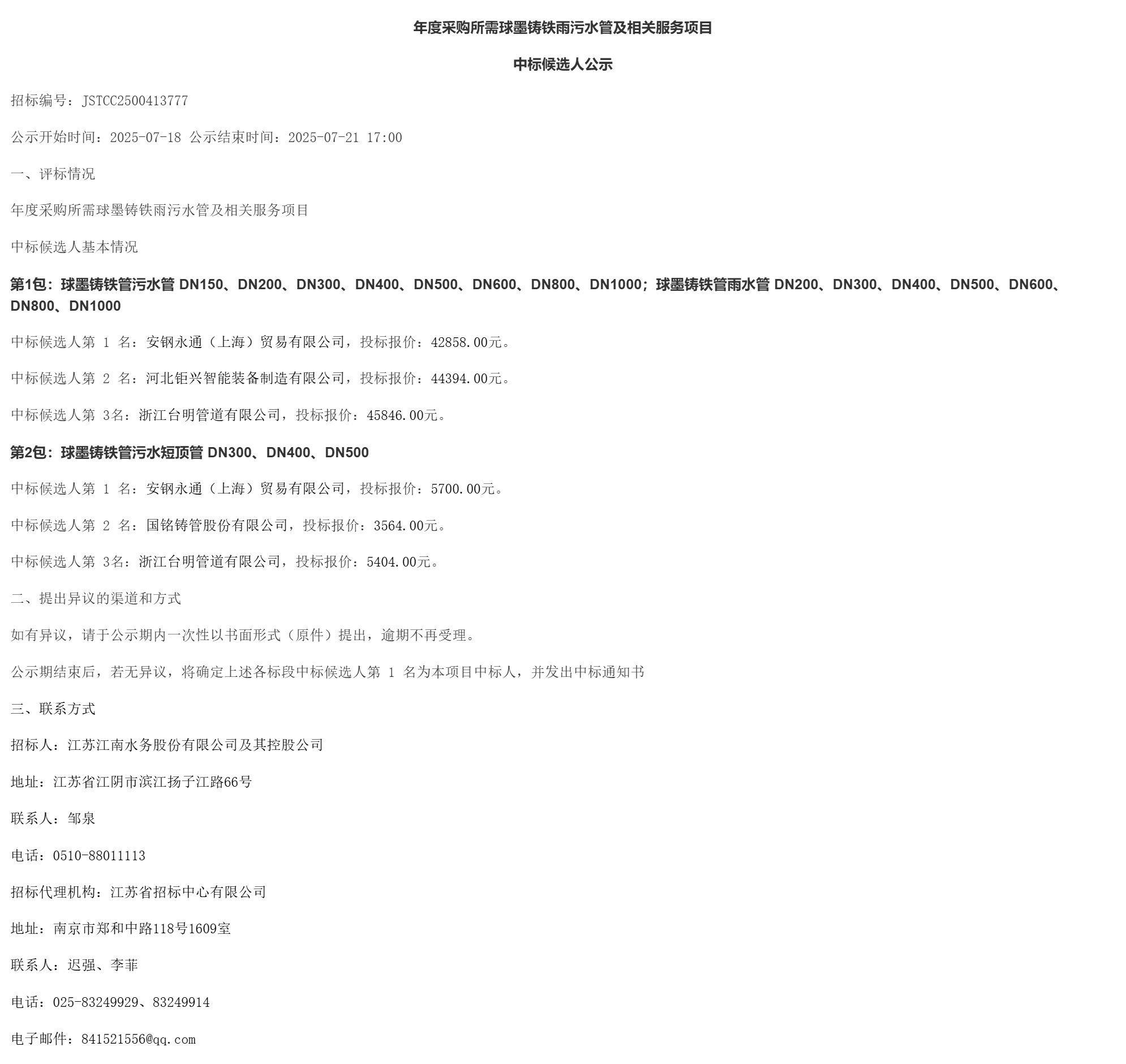中标候选人第 * 名:国铭铸管股份有限公司,投标报价:****.**元。