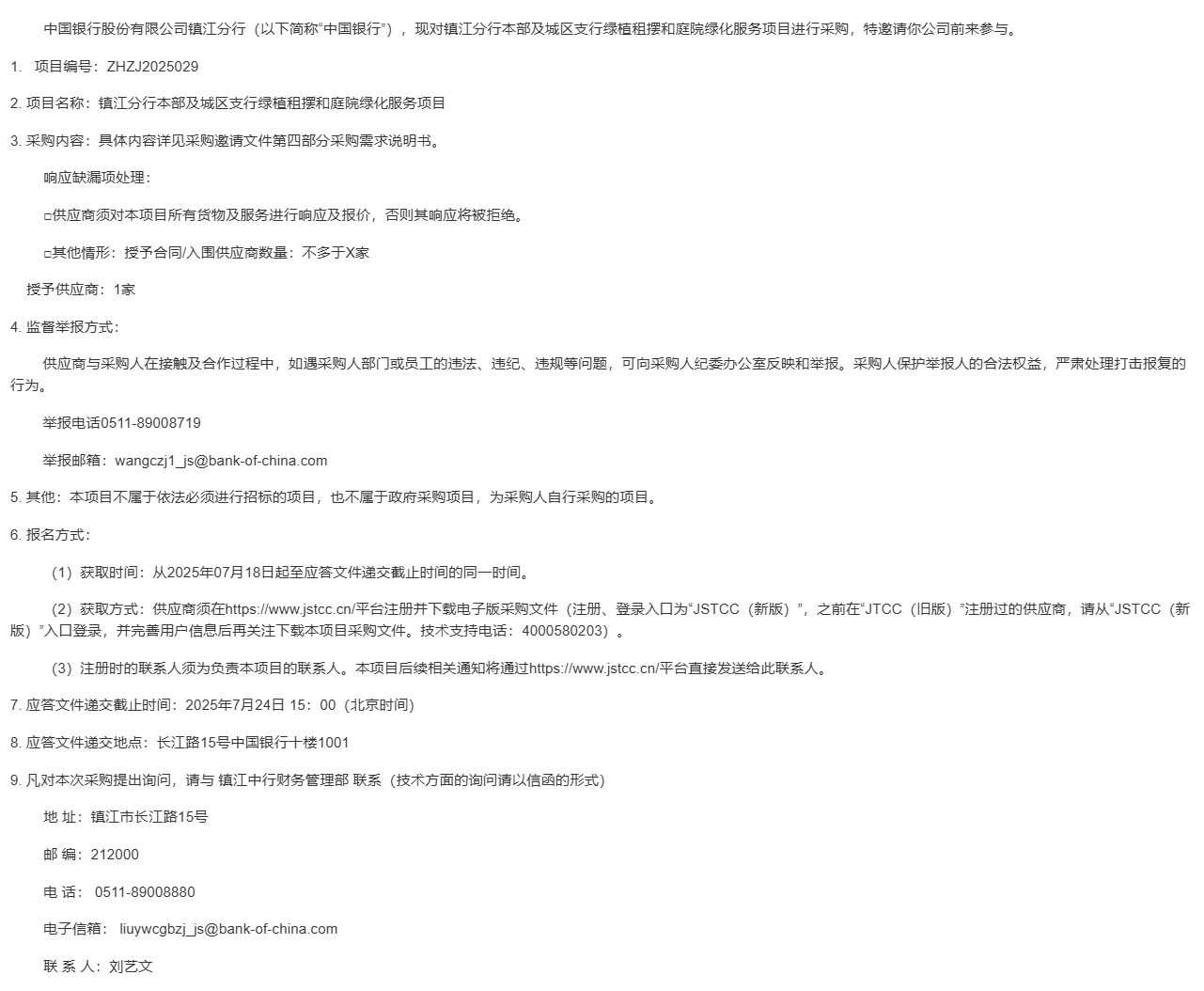 中国银行股份有限公司镇江分行(以下简称“中国银行”),现对镇江分行本部及城区支行绿植租摆和庭院绿化服务项目进行采购,特邀请你公司前来参与。