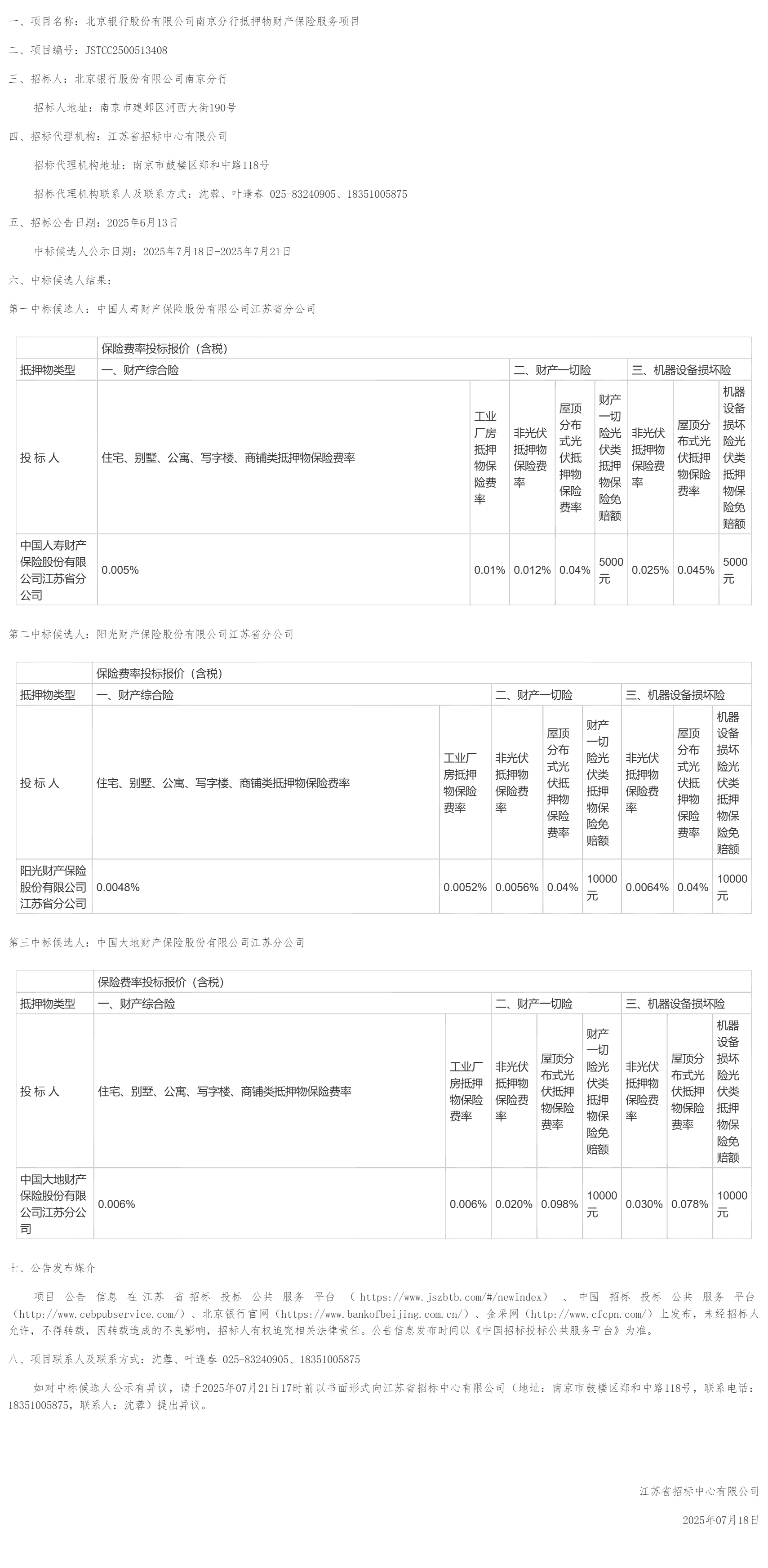 北京银行股份有限公司南京分行抵押物财产保险服务项目中标候选人公示
