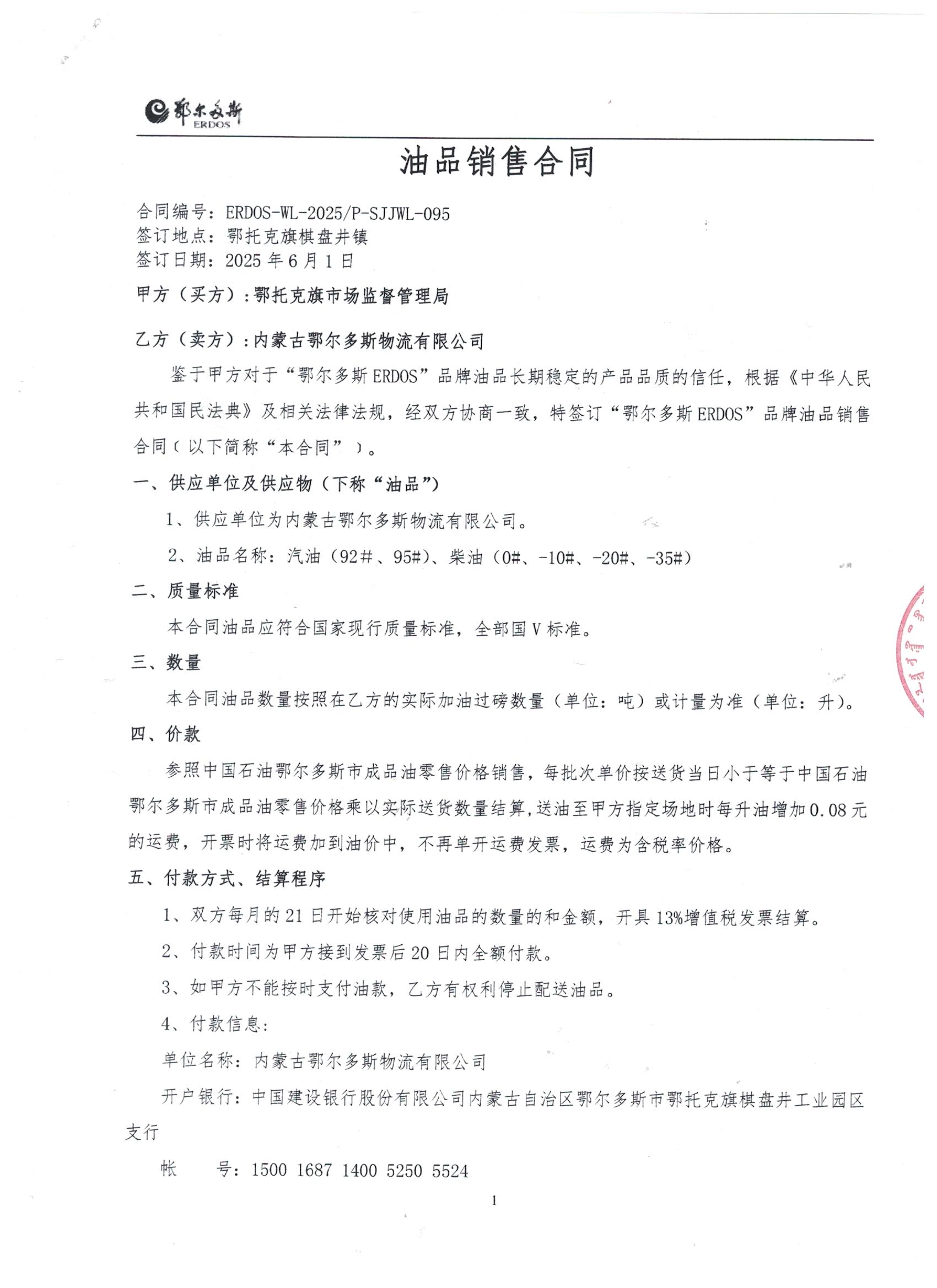 鄂托克旗市场监督管理局油品销售合同政府采购合同公告