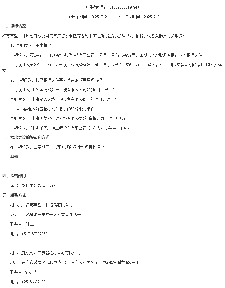 江苏苏盐井神股份有限公司储气库卤水制盐综合利用工程所需氢氧化钙、碳酸钠投加设备采购及相关服务中标候选人公示