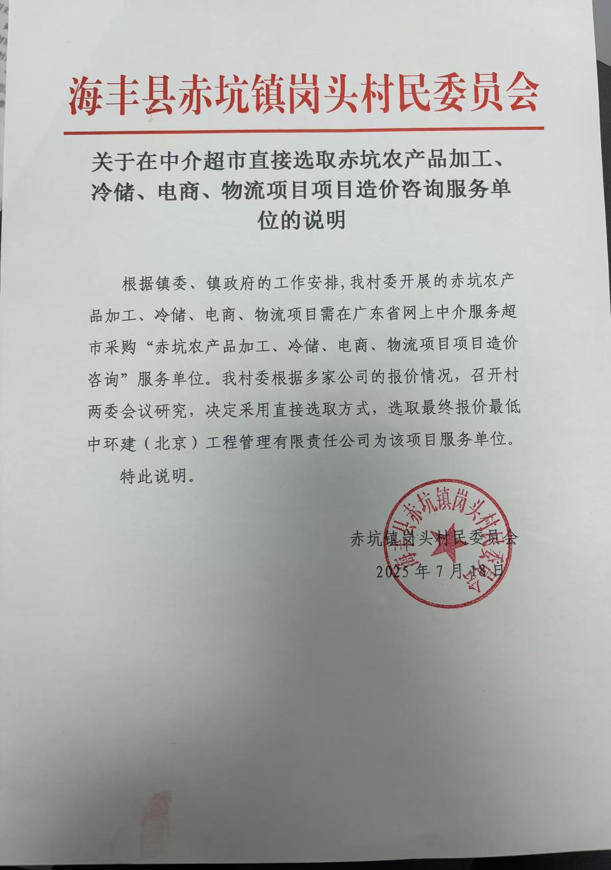 我单位于********** **:**, 在广东省网上中介服务超市为海丰县赤坑镇岗头村民委员会公开选取工程造价咨询中介服务机构,现将中选结果相关事项公告如下: