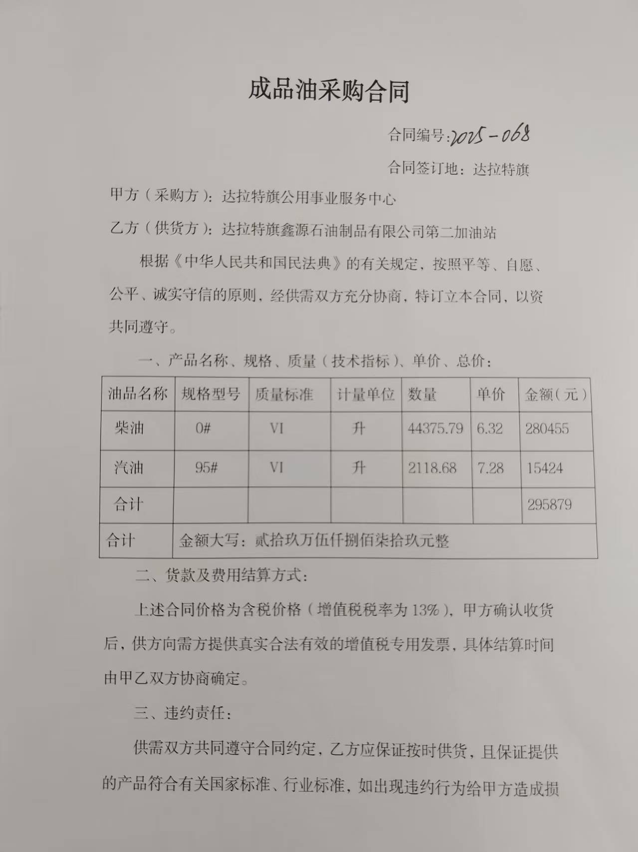 供应商(乙方):达拉特旗鑫源石油制品有限公司第二加油站