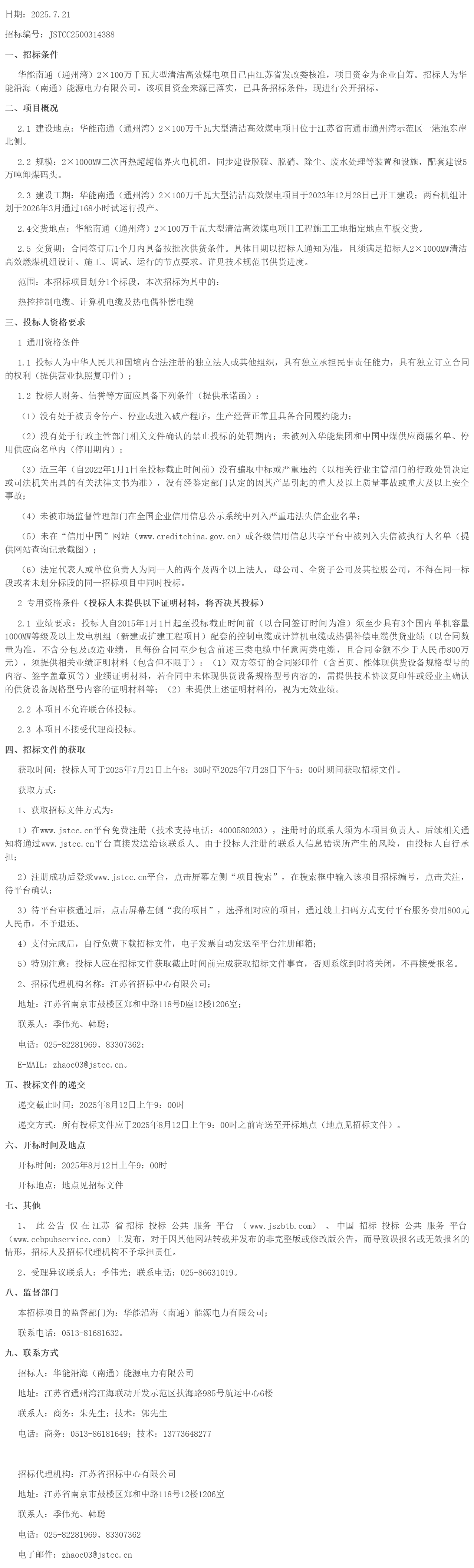 华能南通(通州湾)*×***万千瓦大型清洁高效煤电项目已由江苏省发改委核准,项目资金为企业自筹。招标人为华能沿海(南通)能源电力有限公司。该项目资金来源已落实,已具备招标条件,现进行公开招标。