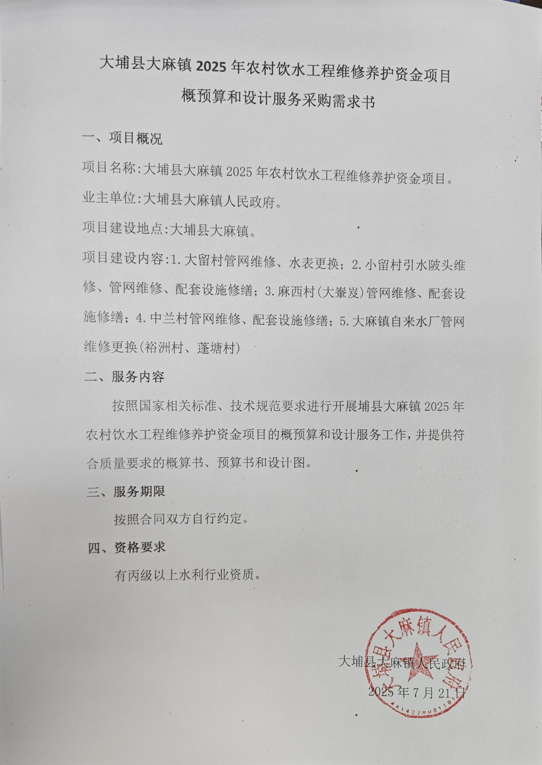 大埔县大麻镇2025年农村饮水工程维修养护资金项目采购公告