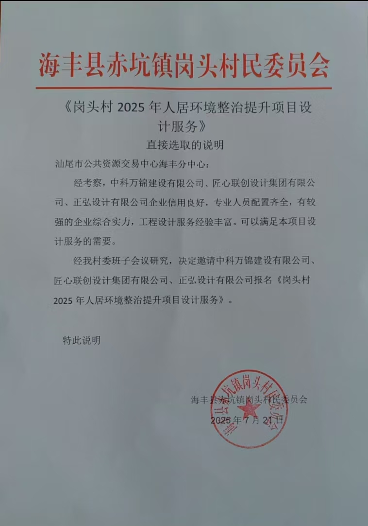 鉴于中科万锦建设有限公司、匠心联创设计集团有限公司、正弘设计有限公司企业信用良好,专业人员配置齐全,有较强的企业综合实力,工程设计服务经验丰富。可以满足本项目设计服务的需要。经我村委班子会议研究,决定邀请三家公司报名《岗头村****年人居环境整治提升项目设计服务》。