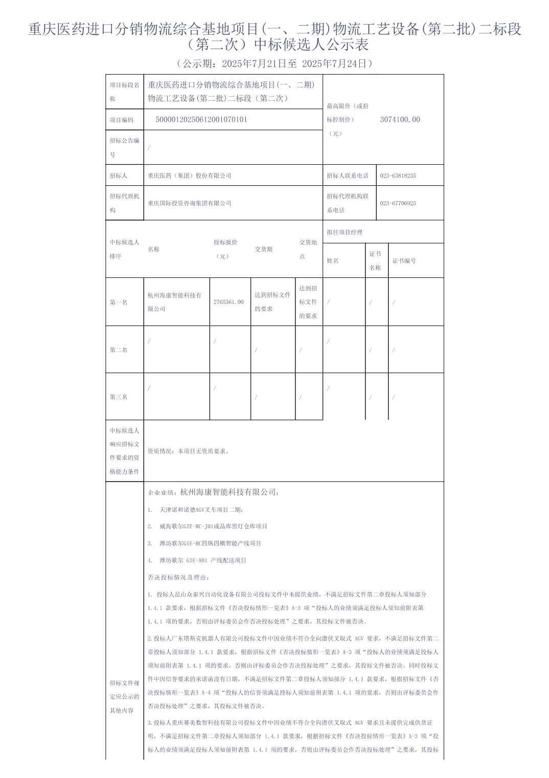 重庆医药进口分销物流综合基地项目(一、二期)物流工艺设备(第二批)二标段(第二次)中标候选人公示表
