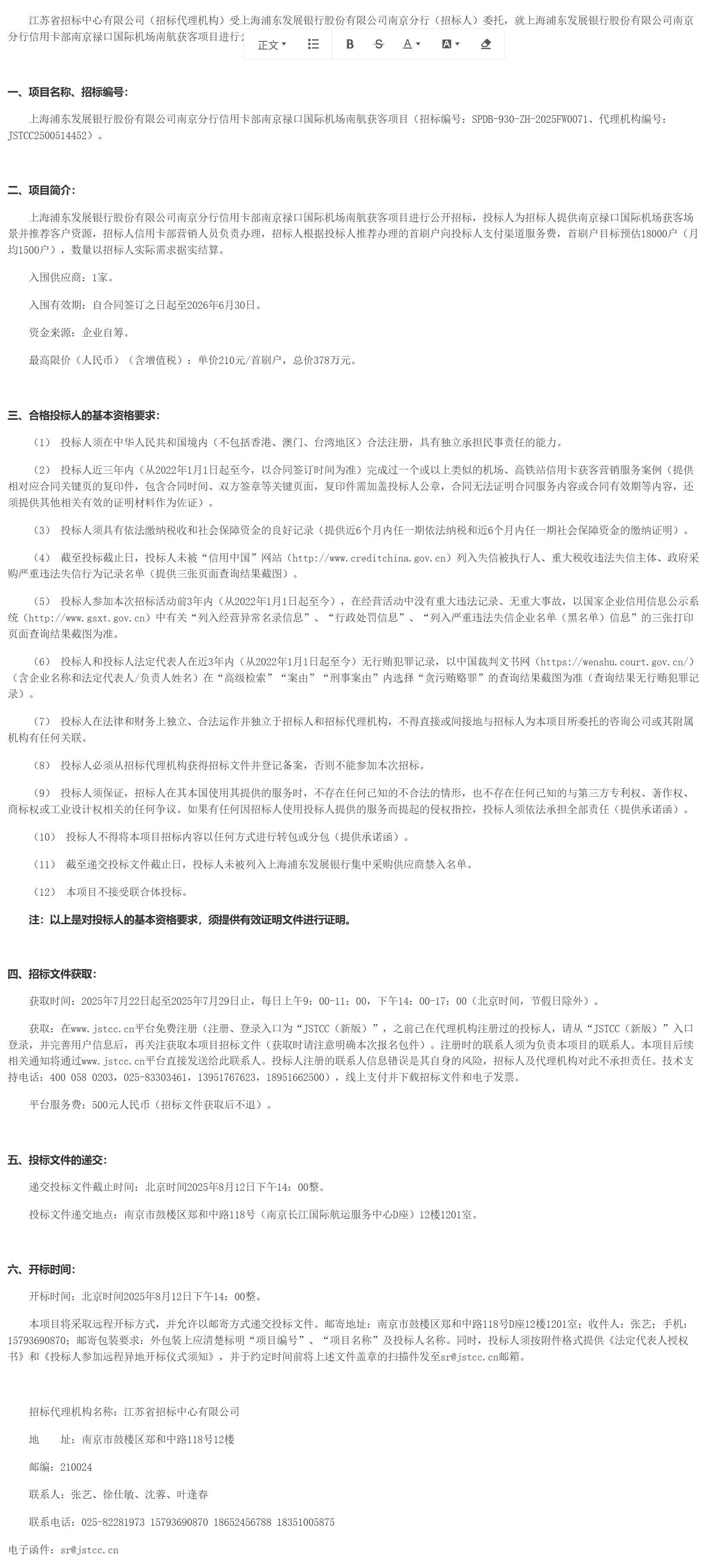 上海浦东发展银行股份有限公司南京分行信用卡部南京禄口国际机场南航获客项目招标公告