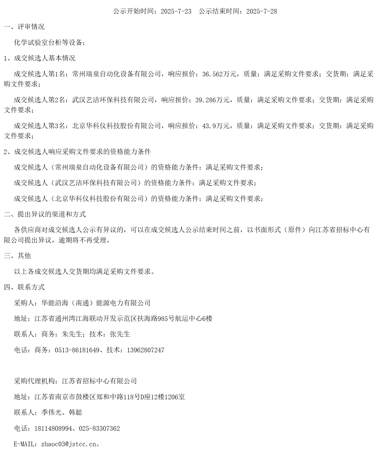 华能南通(通州湾) 2×100万千瓦大型清洁高效煤电项目化学试验室台柜等设备成交候选人公示(JSTCC2500313868)