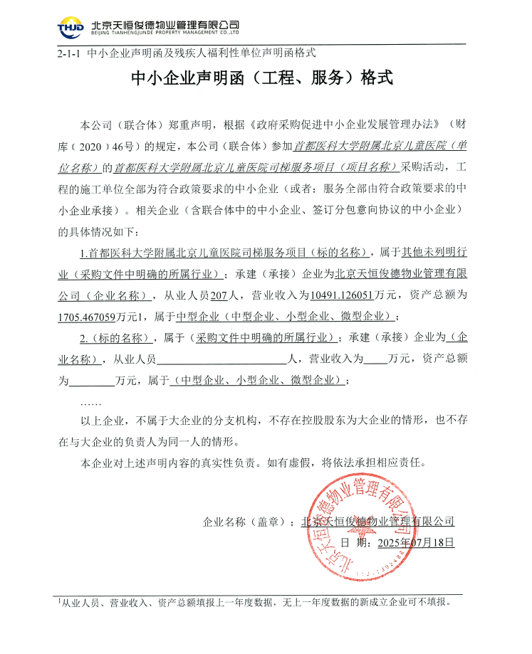 | 北京天恒俊德物业管理有限公司 | * | ****.******万元 | ****.******万元 | 首都医科大学附属北京儿童医院司梯服务项目,具体内容详见招标文件 |