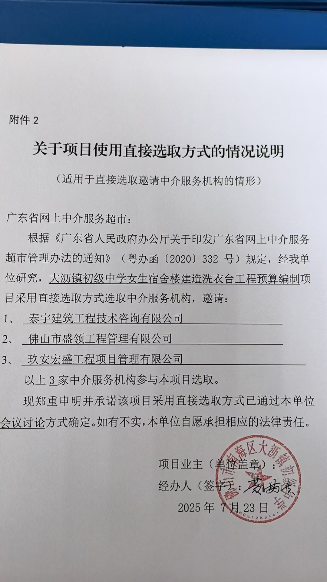 大沥镇初级中学女生宿舍楼建造洗衣台工程预算编制项目,由于项目时间紧,项目质量要求较高,选取的服务机构需要有资质、业务经验丰富、服务质量好,符合项目要求。