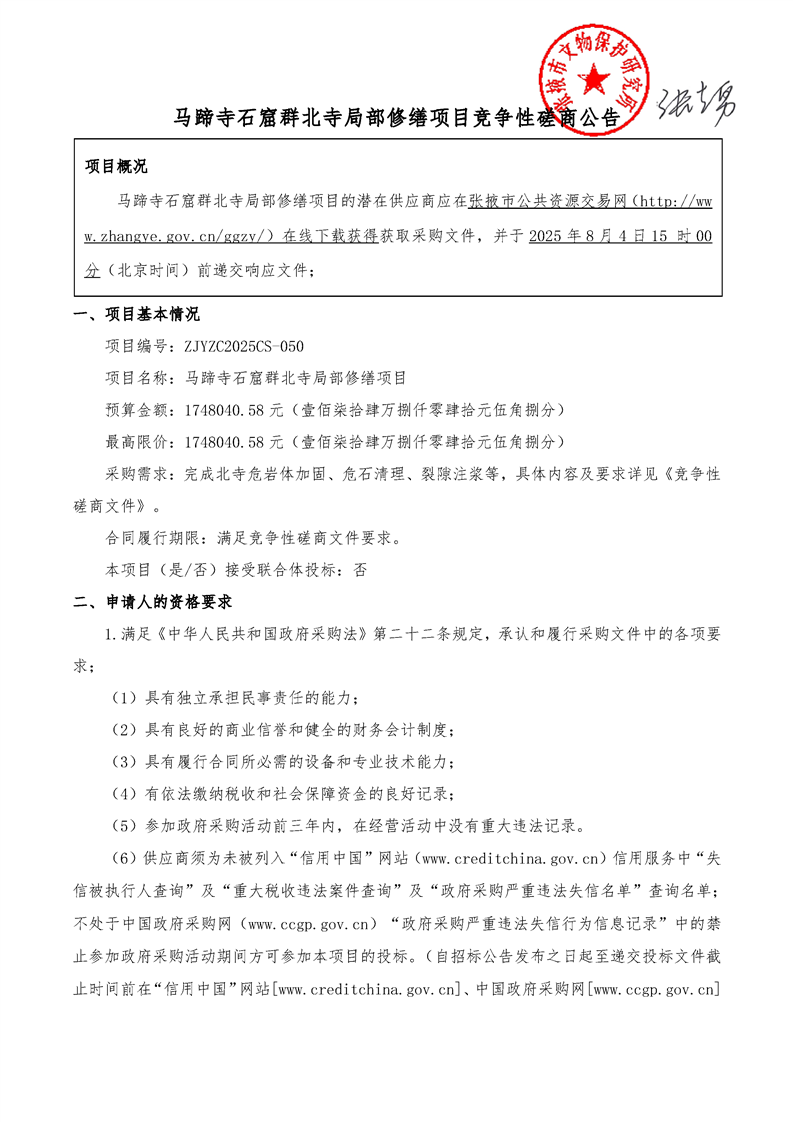 马蹄寺石窟群北寺局部修缮项目竞争性磋商公告采购/资审公告