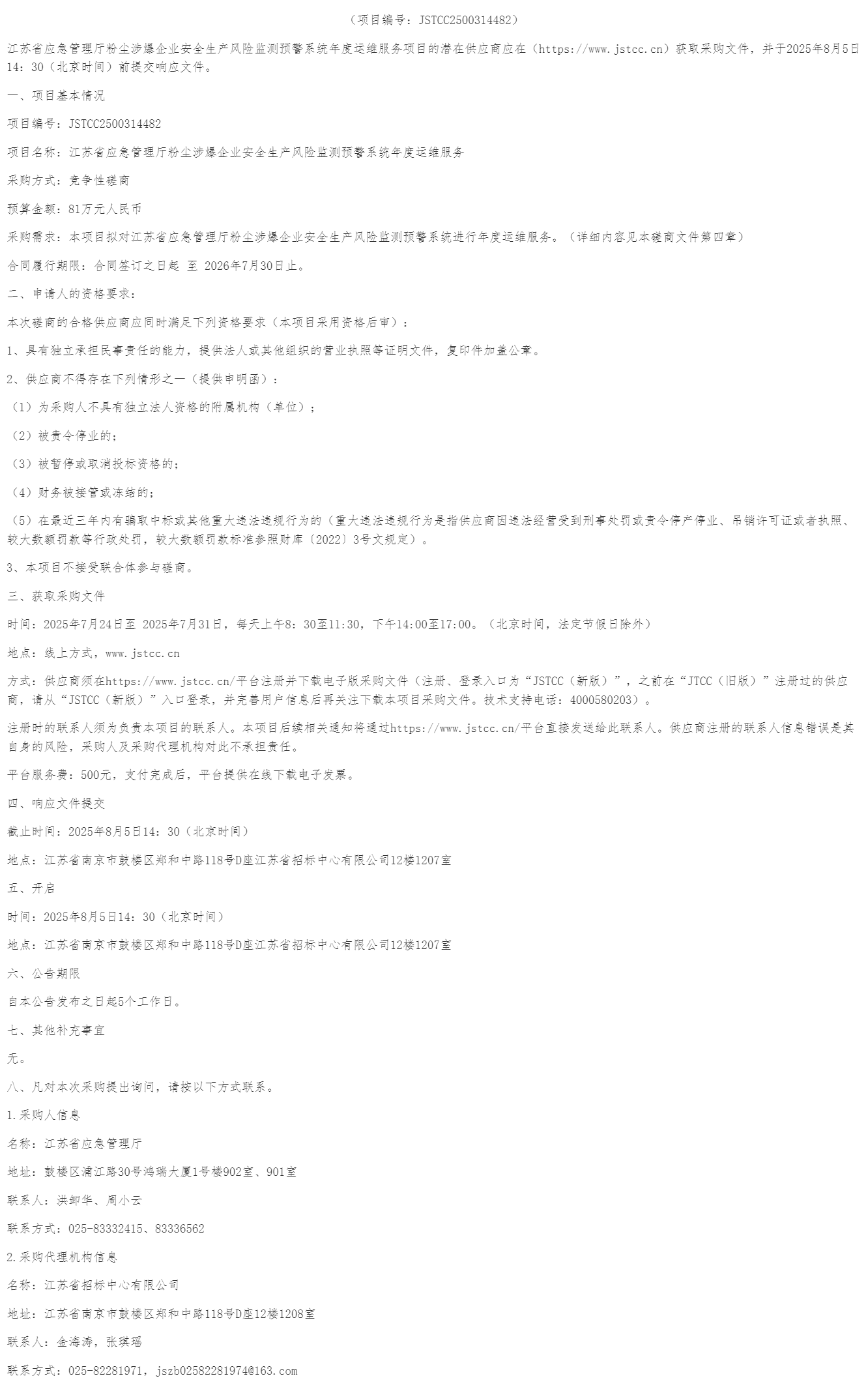 江苏省应急管理厅粉尘涉爆企业安全生产风险监测预警系统年度运维服务竞争性磋商采购公告