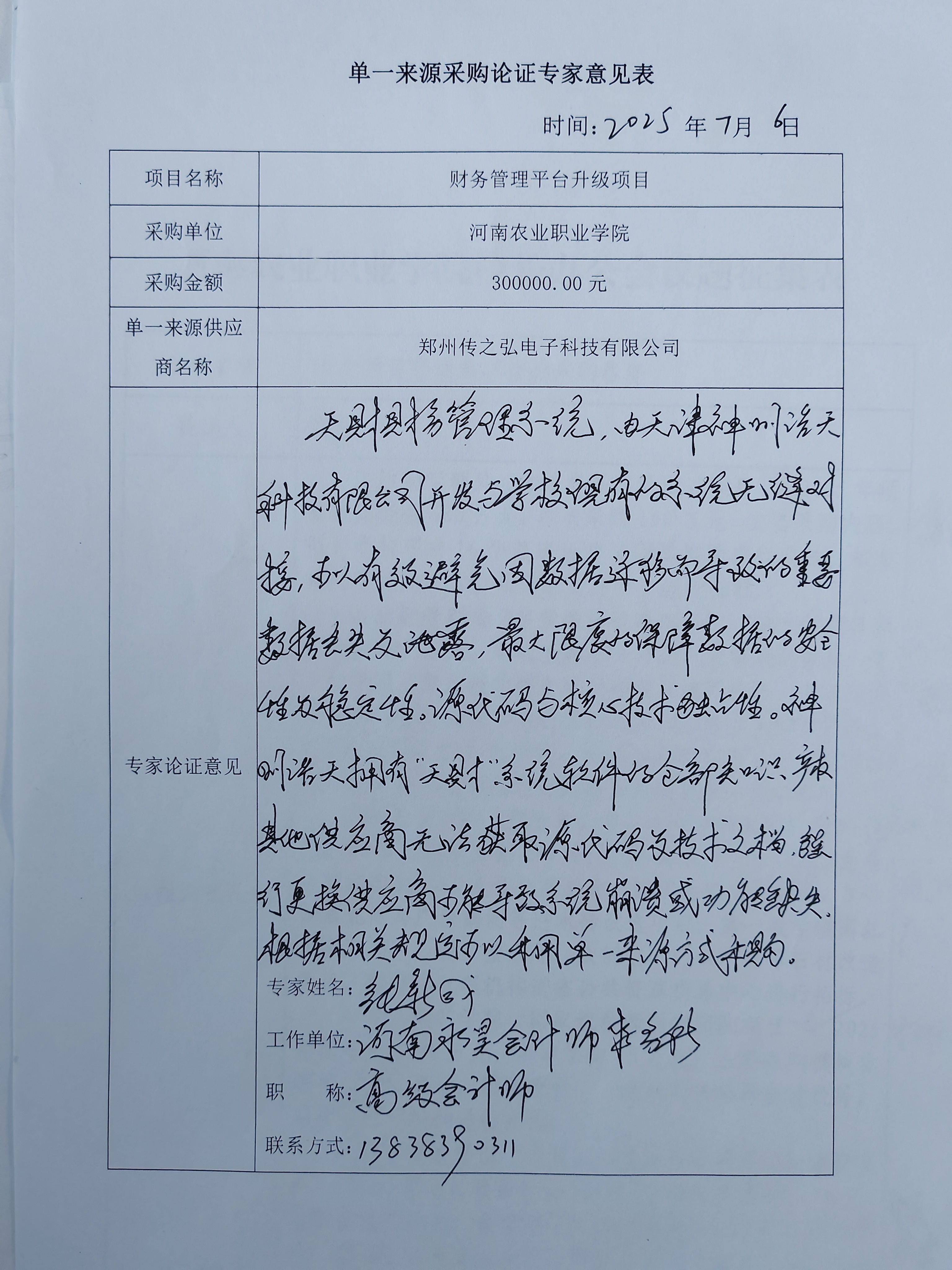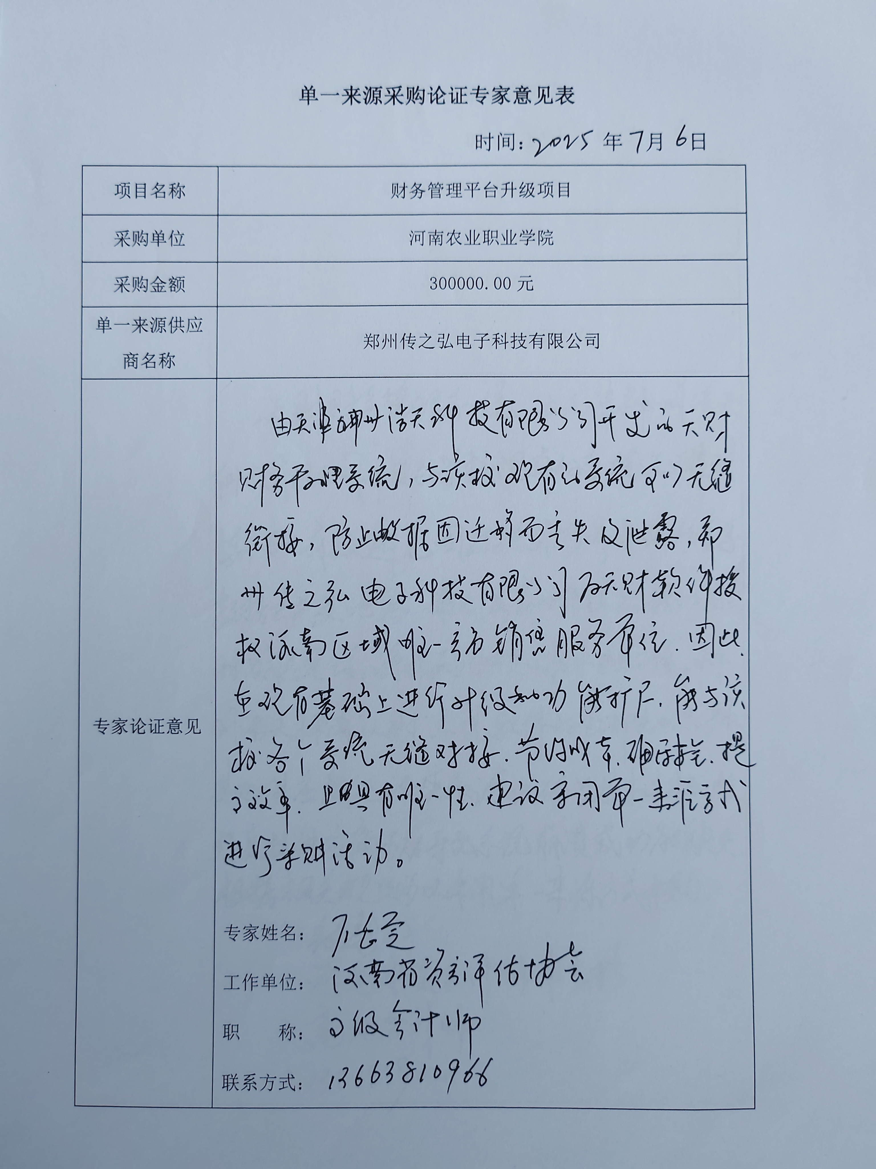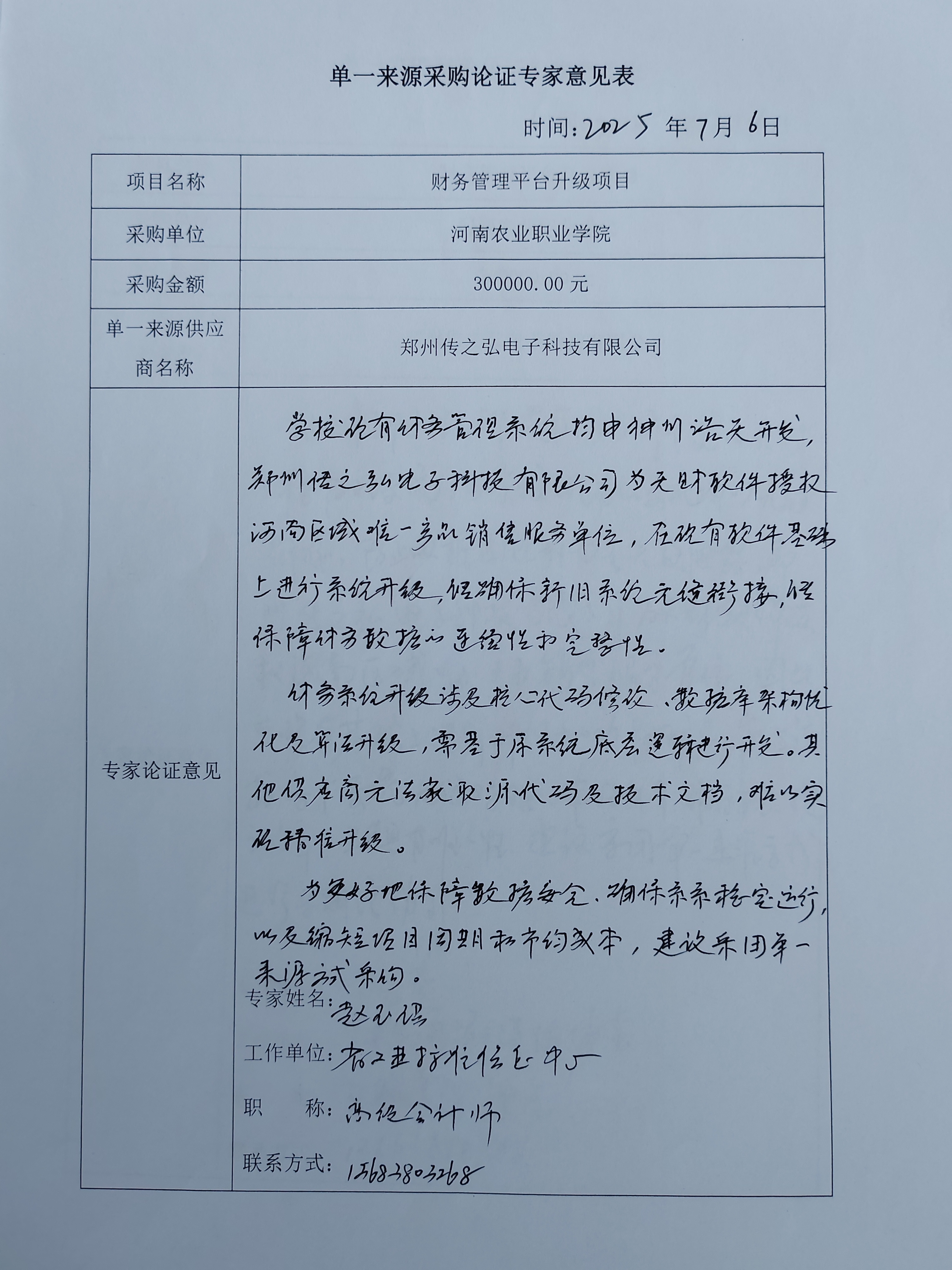 河南农业职业学院财务管理平台升级项目单一来源采购公示