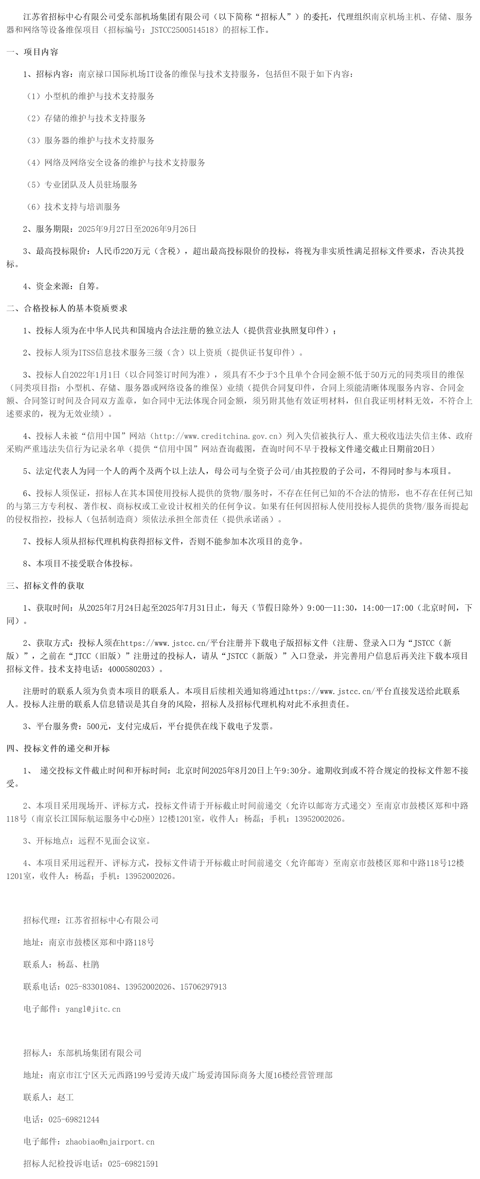 江苏省招标中心有限公司受东部机场集团有限公司(以下简称“招标人”)的委托,代理组织南京机场主机、存储、服务器和网络等设备维保项目(招标编号:***************)的招标工作。