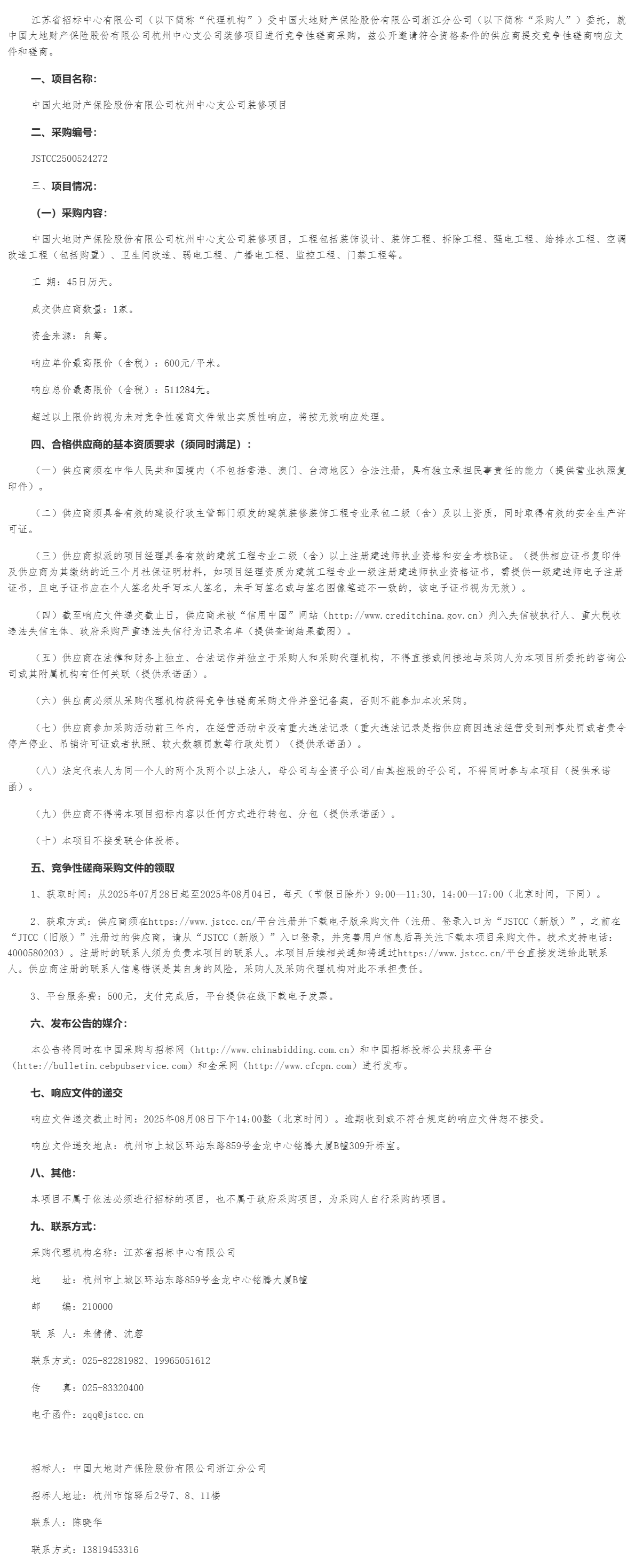 中国大地财产保险股份有限公司杭州中心支公司装修项目竞争性磋商公告(第二次)