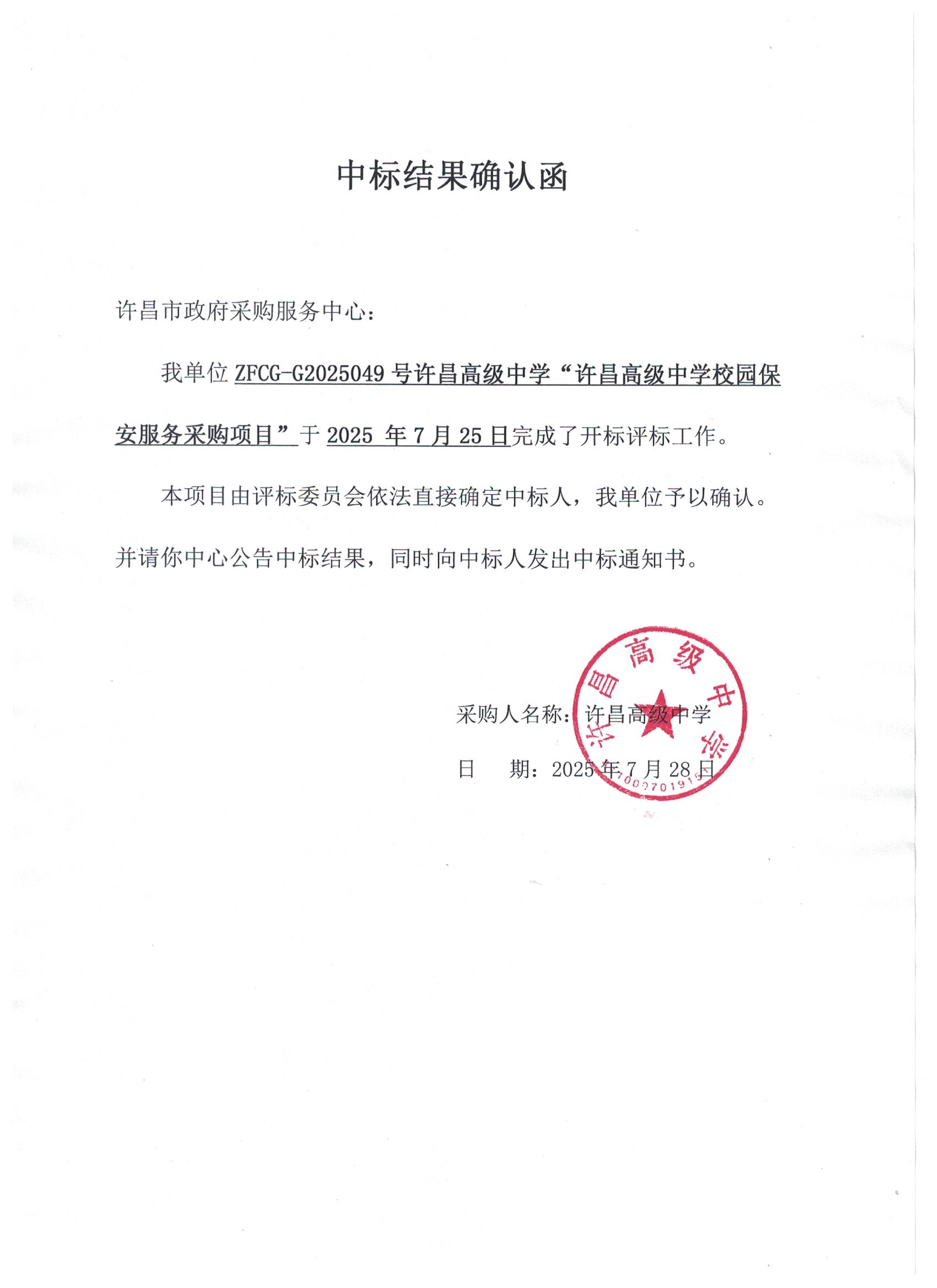 ZFCG-G2025049号许昌高级中学“许昌高级中学校园保安服务采购项目”-中标公告