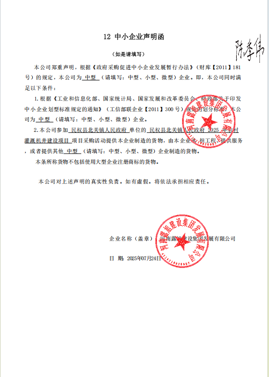 民权县北关镇人民政府2025年农村灌溉机井建设项目-结果公告